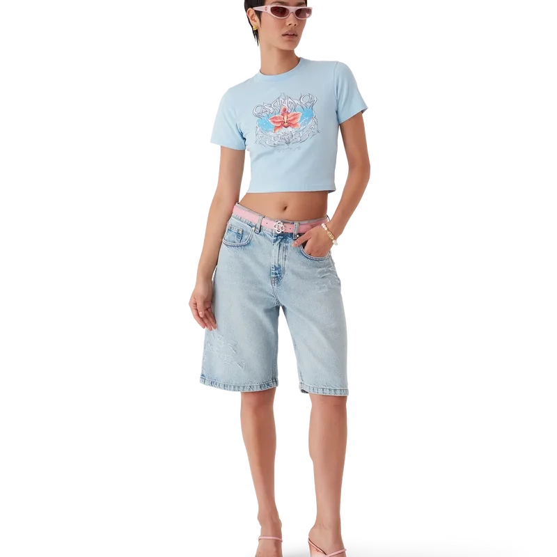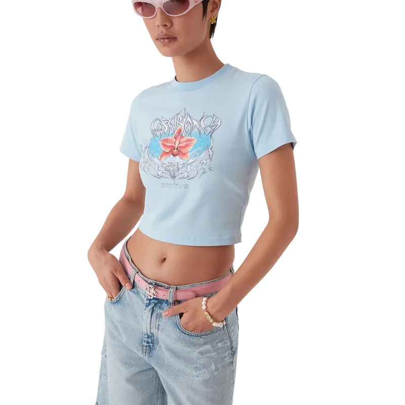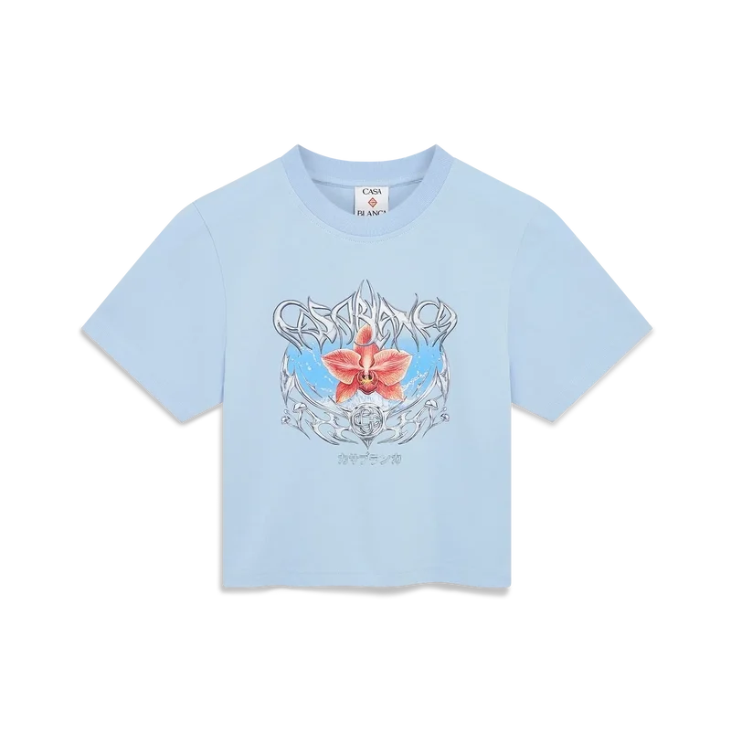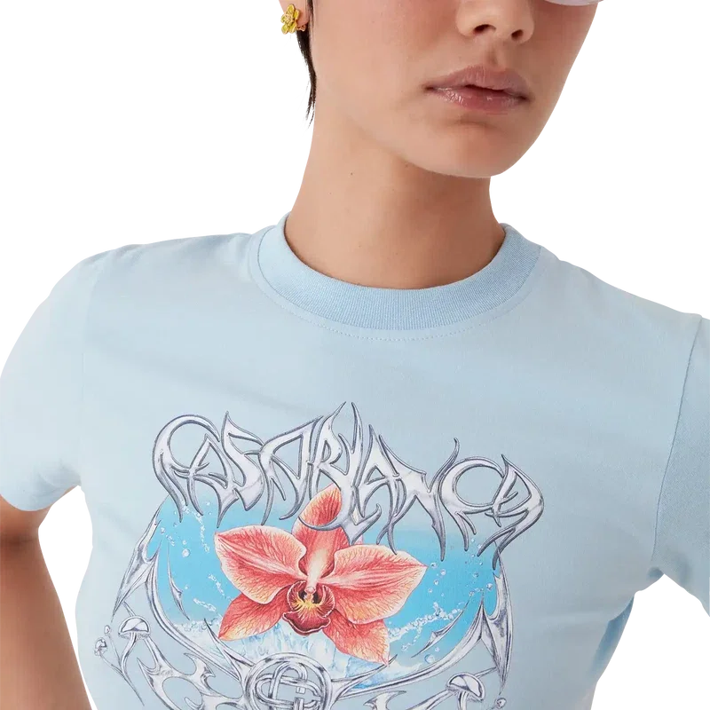 Blades kort T-shirt är en figursydd, tryckt modell med ett motiv som leker med kontrasten mellan två motsatta känslor – bladets skärpa och den kalla, silverkromade ytan, i kontrast till naturens värme, som de djärva rosa och röda tonerna i en orkidéblomma. Tillägget av vatten ger designen ett friskt, fräscht inslag. Avslutas med en klassisk rund hals.
