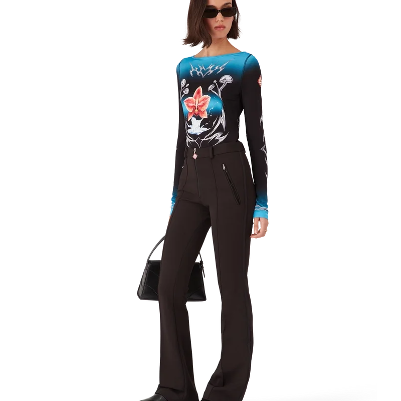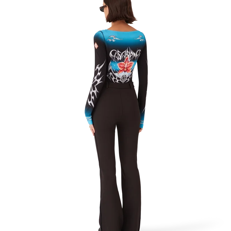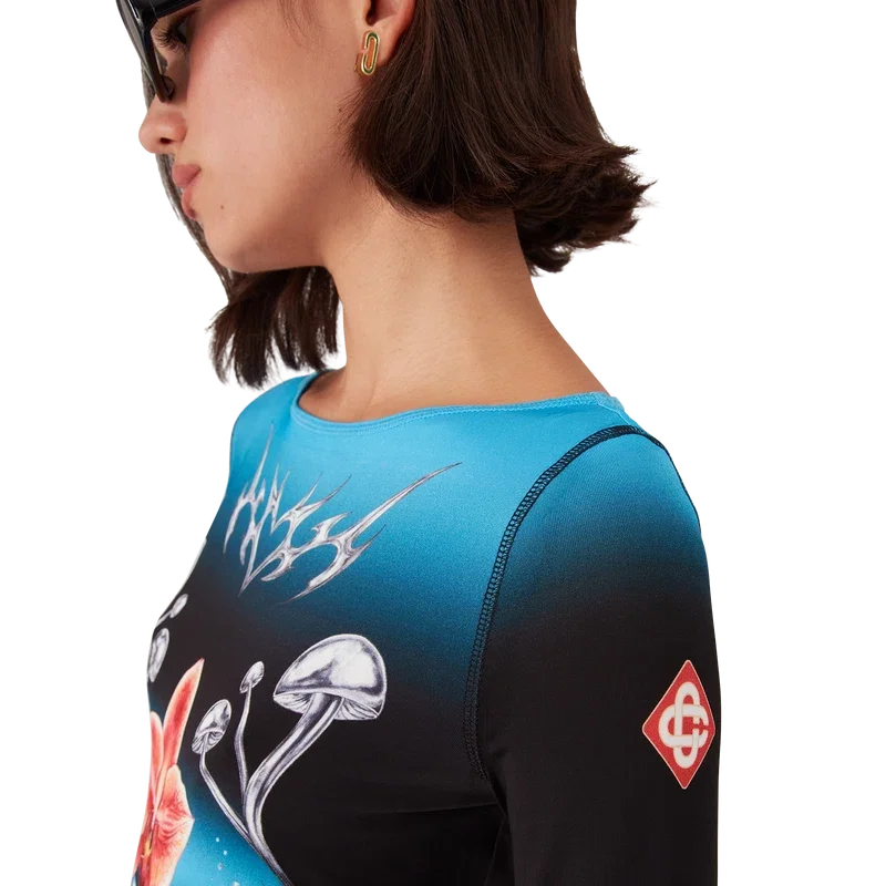 Blades långärmad tröja har ett tryckt mönster med säsongens Blades-motiv som leker med kontrasten mellan två motsatta känslor – bladets skärpa och den kalla, silverkromade ytan, i kontrast till naturens värme, som de djärva rosa och röda tonerna i en orkidéblomma. Tillägget av vattendroppar ger designen ett friskt och fräscht inslag. Avslutas med båthals, randiga manschettdetaljer och märkets signaturdiamantlogo på ärmarna.