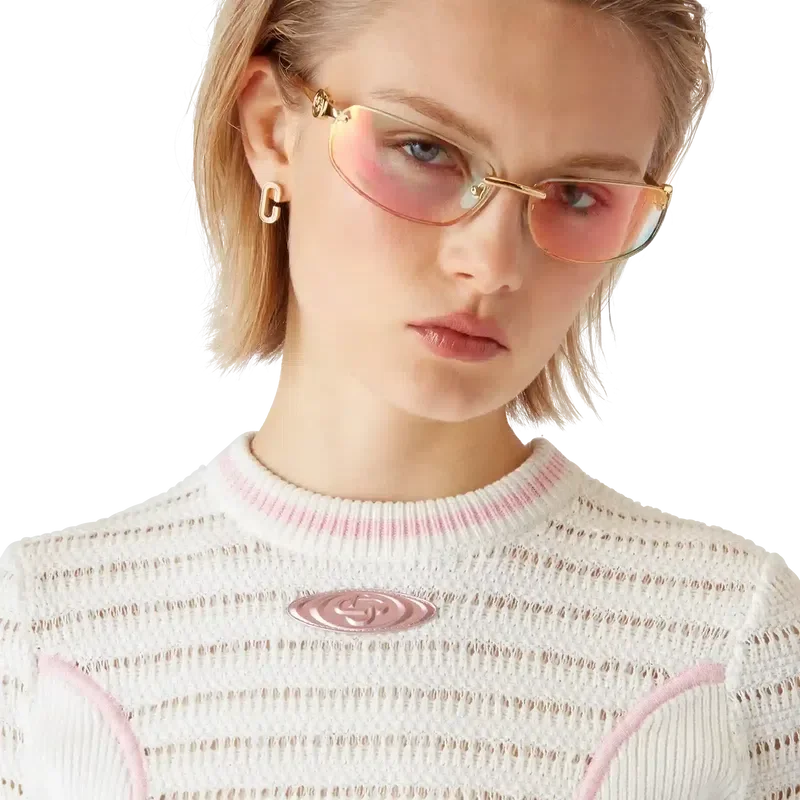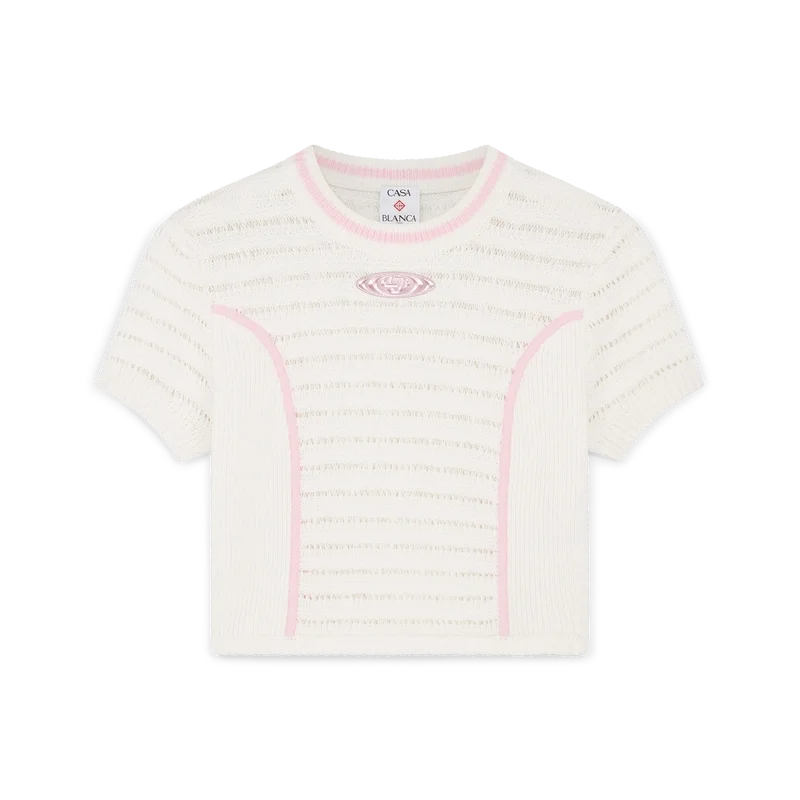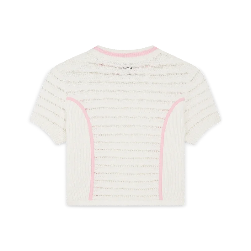 Bourgeoisie Girl-toppen är en kortärmad modell med märkets Warped-logotyp i en glasliknande effekt. Den är designad för att bäras tillsammans med den matchande Bourgeoisie Girl-kjolen, och silhuetten speglar märkets blandning av lediga koder och raffinerad konstruktion. Avslutas med ribbad krage, muddar och fåll, ribbade paneldetaljer och kontrastsömmar.