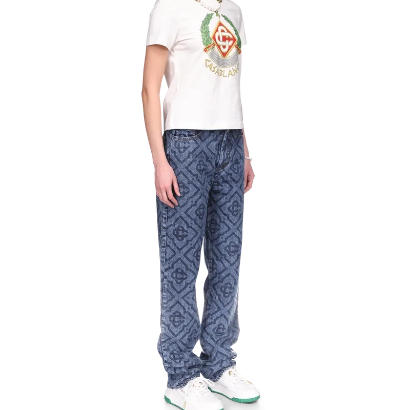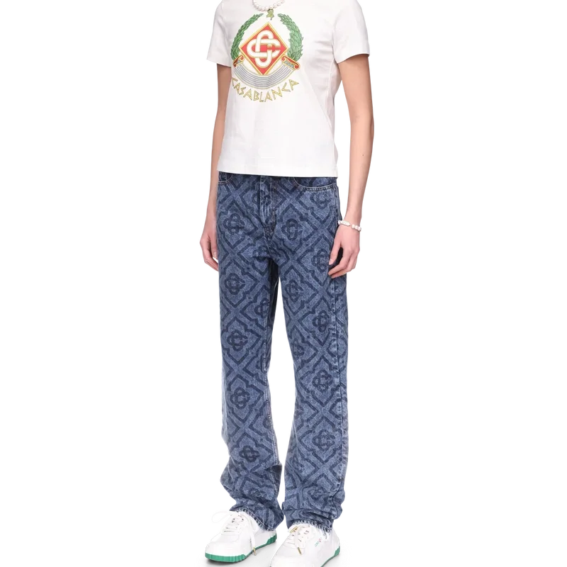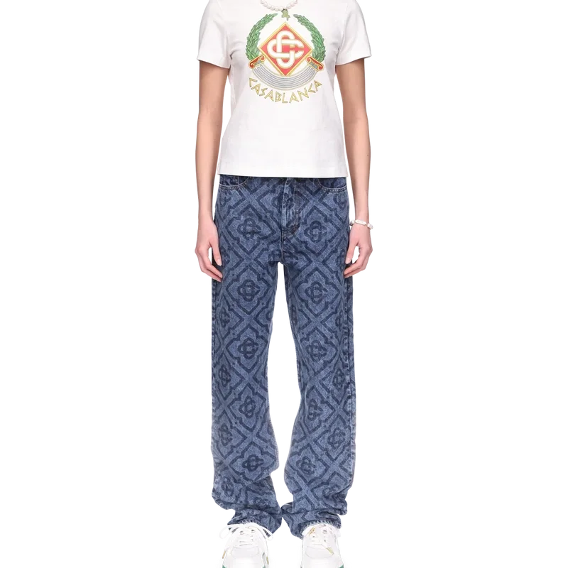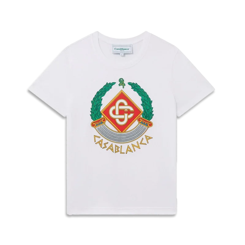 Casa Crest T-shirt är en kortärmad T-shirt med tryck, tillverkad av bomullstyg. Den har ett säsongsbetonat motiv där huset leker med kolonnen som en symbol för Grekland, samt vår version av ett snedställt logo, vilket skapar en imaginär Casa Crest från antiken. Den har Casablanca skrivet i antik grekisk stil och en klassisk rund halsringning.