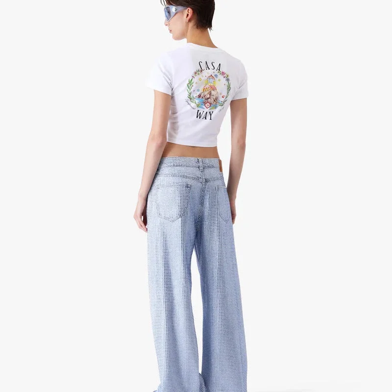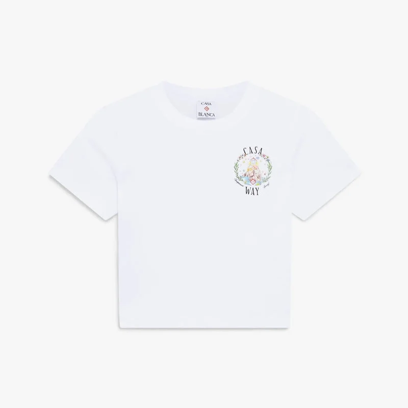 White Casa Way Baby-T-shirt med korta ärmar har en kortare modell och pryds av säsongens Casa Way-motiv, som skildrar den utopiska visionen av Ibiza som en destination för en nästan religiös upptäcktsresa genom dess mångfacetterade musiklandskap. Den har en klassisk rund halsringning och en smal passform.