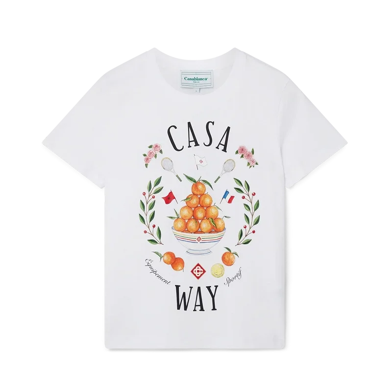 Casa Way T-shirt har ett tryck av husets signaturkonstverk som har tolkats om för denna säsong med inslag av tennis. Tillverkad av 100 % ekologisk bomull och kompletterad med en klassisk rund halsringning och Casablanca-märkesetikett.