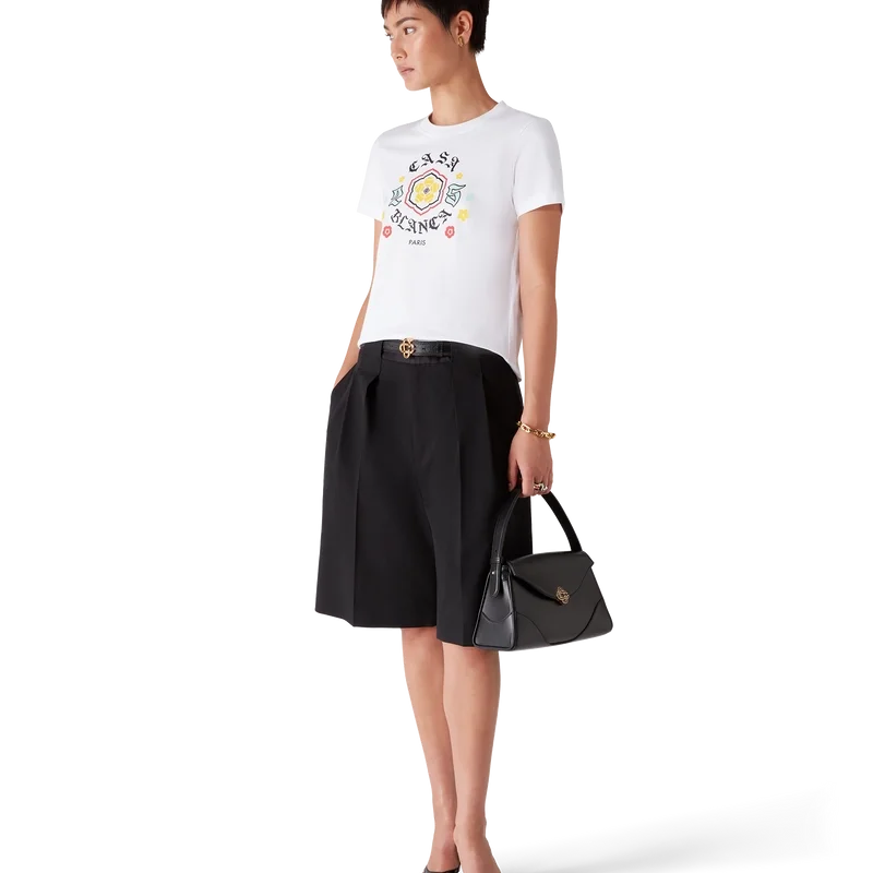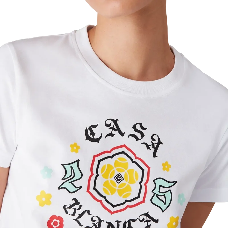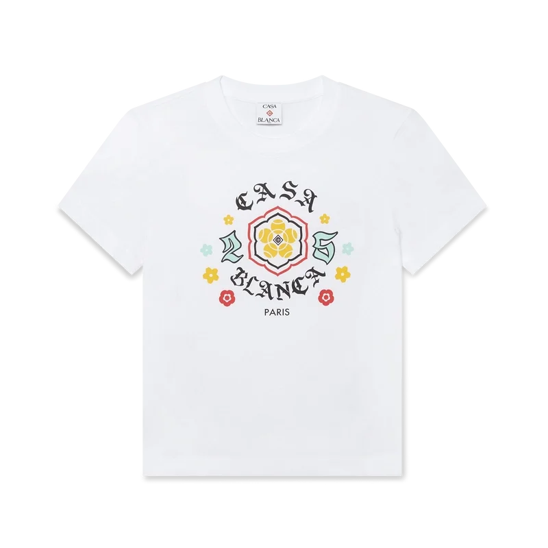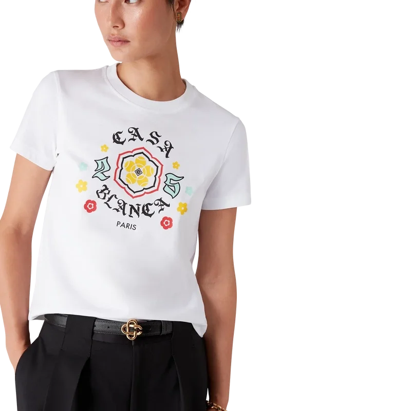 Den figursydda T-shirten med emblem är en kortärmad modell med säsongens motiv, där vi hämtat inspiration från den japanska subkulturen BōSōZoku för ett av våra huvudteman. Kontrasten mellan grafiska element och text kändes väldigt Casablanca för oss. Vi skapade vår egen tolkning av BōSōZoku-konstverk och införlivade fraser som beskriver varumärket, som ”Looking at the Beauty of the World”.