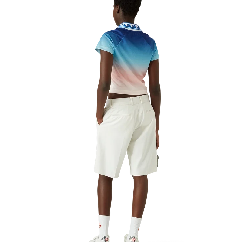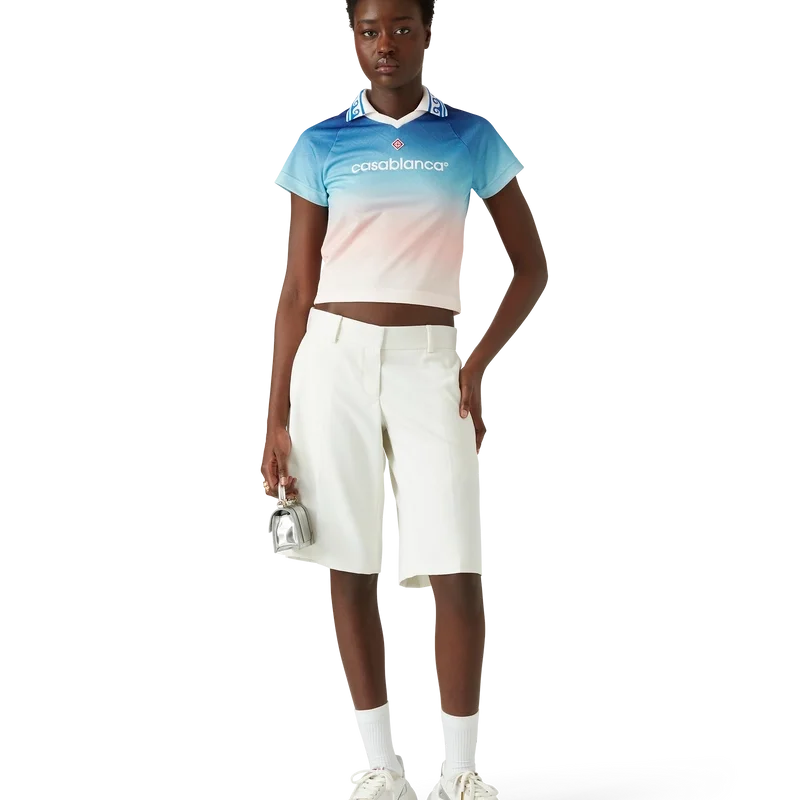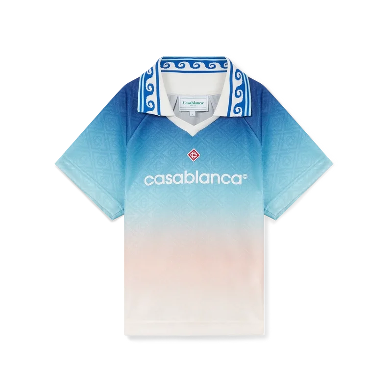 Jacquard Monogram-fotbollskjortan är en figursydd, kortare sportkjol med korta ärmar och husets signaturmönster, Diamond Monogram. Tillverkad i ett jacquardtyg med gradientmönster och kompletterad med husets signaturlogo i form av en diamant, en kontrasterande ribbad krage och ett Casablanca-logo över bröstet.