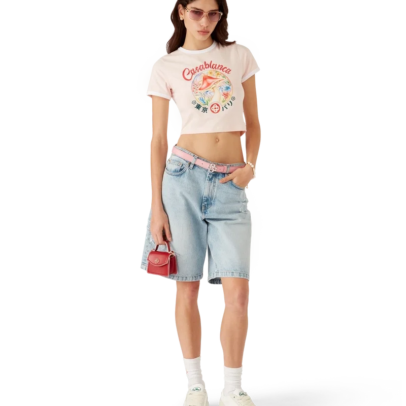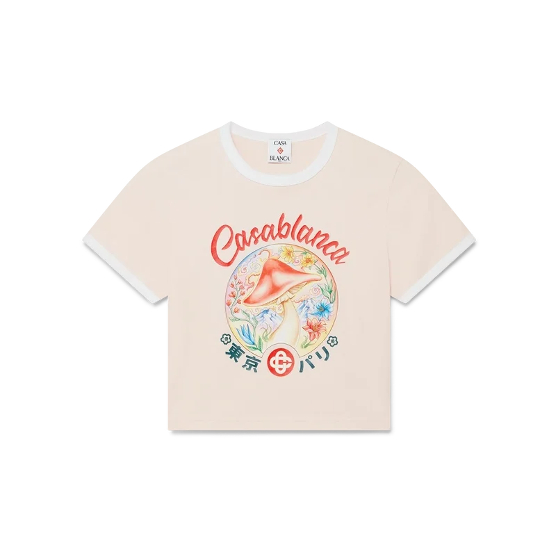 Den korta T-shirten med svampemblem är en kortärmad modell med ett av husets signaturdesignelement – svampen – tillverkad av Pima-bomullstyg. Avslutas med en klassisk rund hals. Designad för att sitta ovanför naveln.