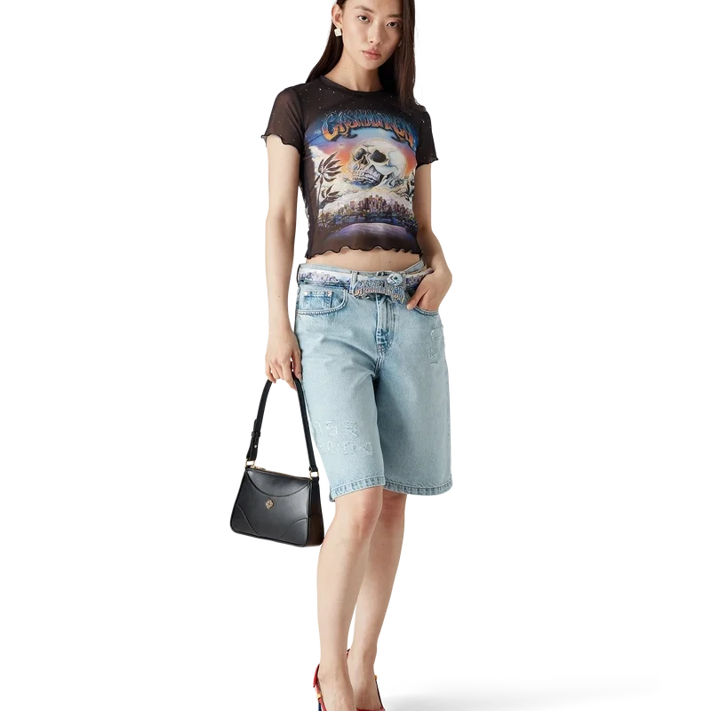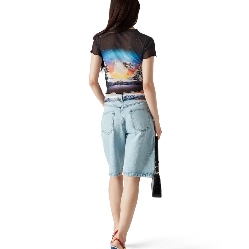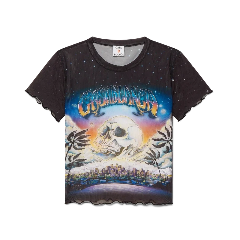 La Pramonition Mesh T-shirt är en kortärmad T-shirt med tryck, tillverkad i mesh-tyg med ett signaturmotiv inspirerat av en kuslig vision av La Pramonitions silhuett på natten, med UFO-element som anspelar på vintage-inspirerad science fiction.