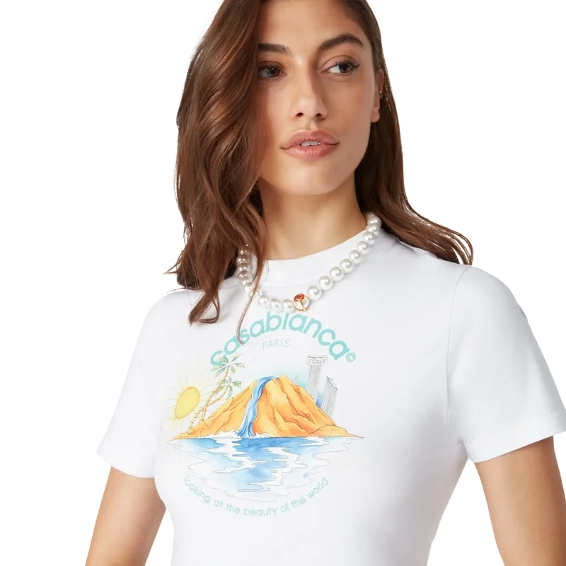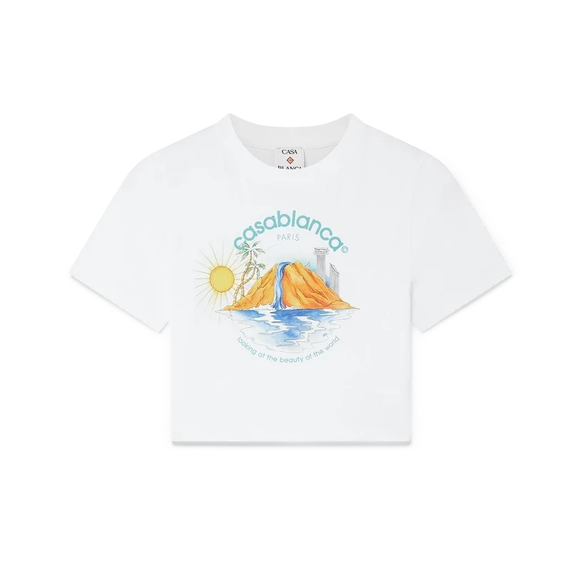 Oasis Cropped T-shirt är en kortärmad T-shirt med tryck, tillverkad av ekologisk bomull, med husets säsongsbetonade konstverk med designelement från naturen, arkitektur och tennis. Avslutas med en klassisk rund hals. Designad för att sitta ovanför naveln.