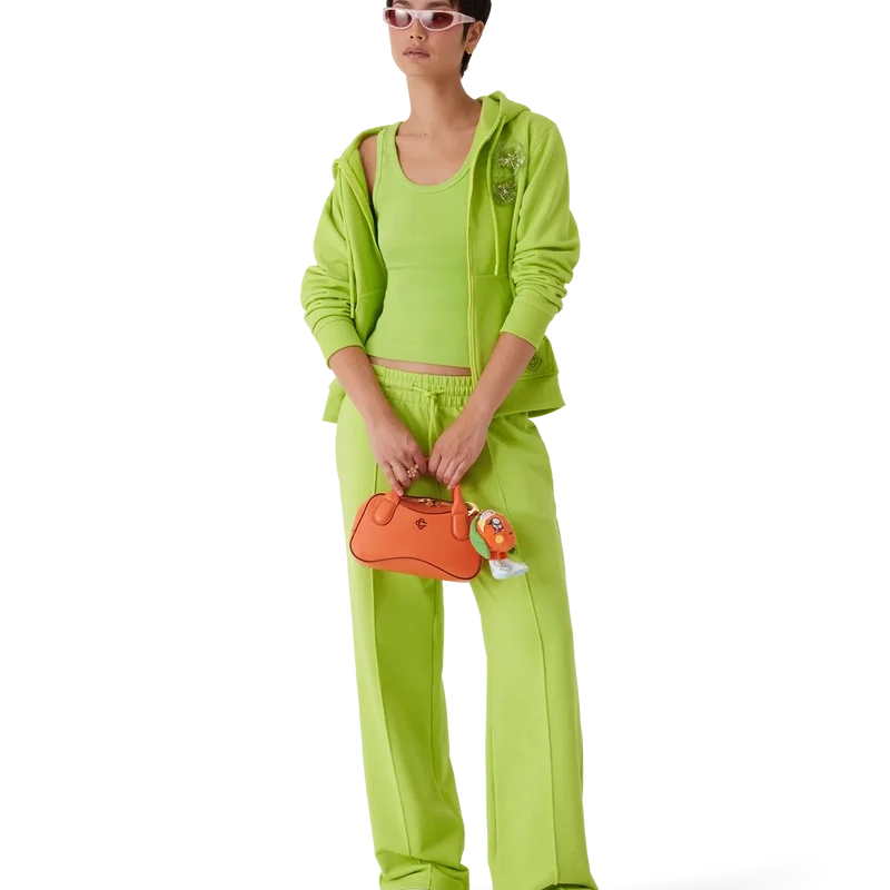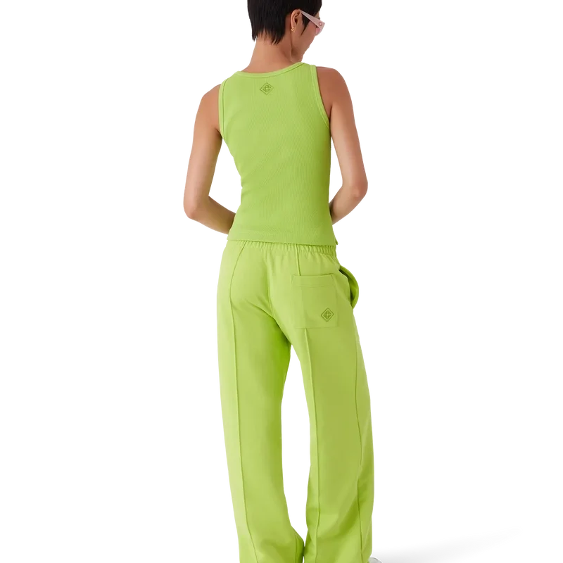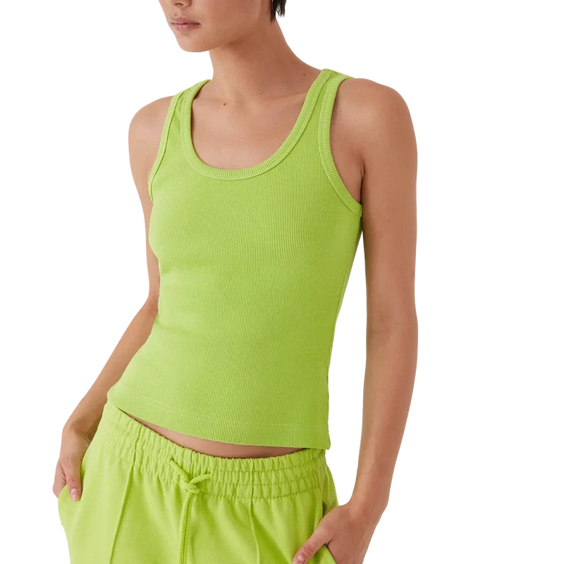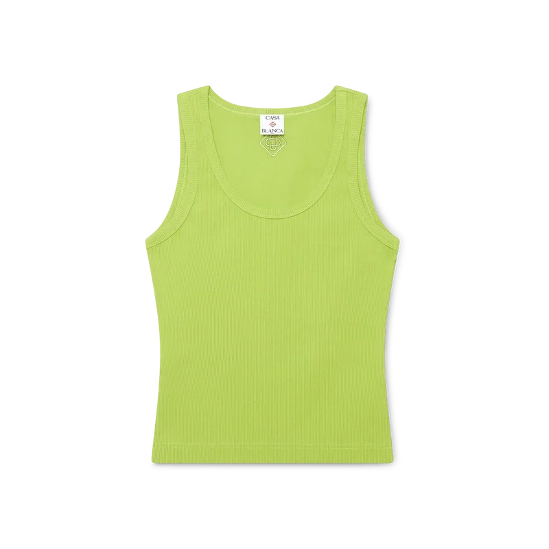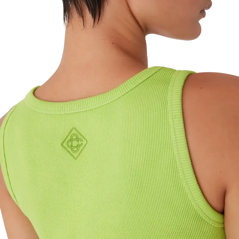 Den ribbade linne är en åtsittande, kort Shorts-modell utan ärmar, tillverkad i ribbat jerseytyg. Den har en logotyp-patch i metall, rund halsringning och vita kontrasterande vågmönster längs kanten vid halsen och ärmhålen.