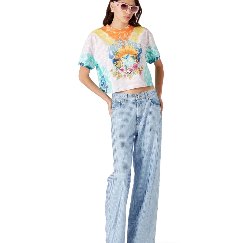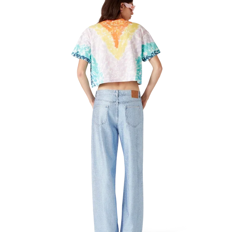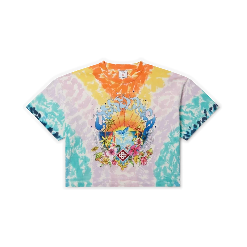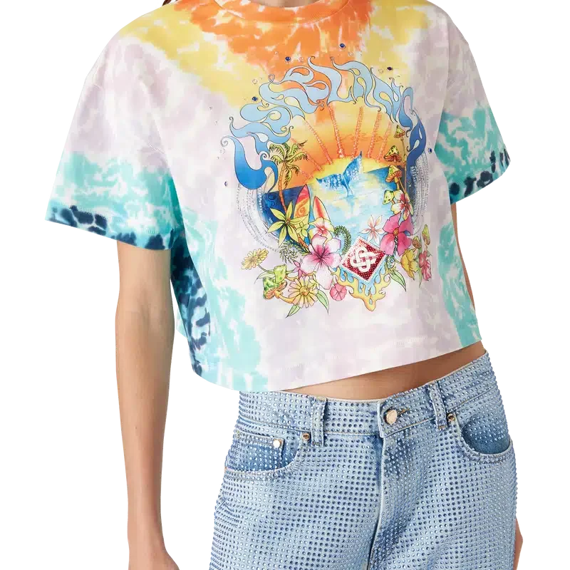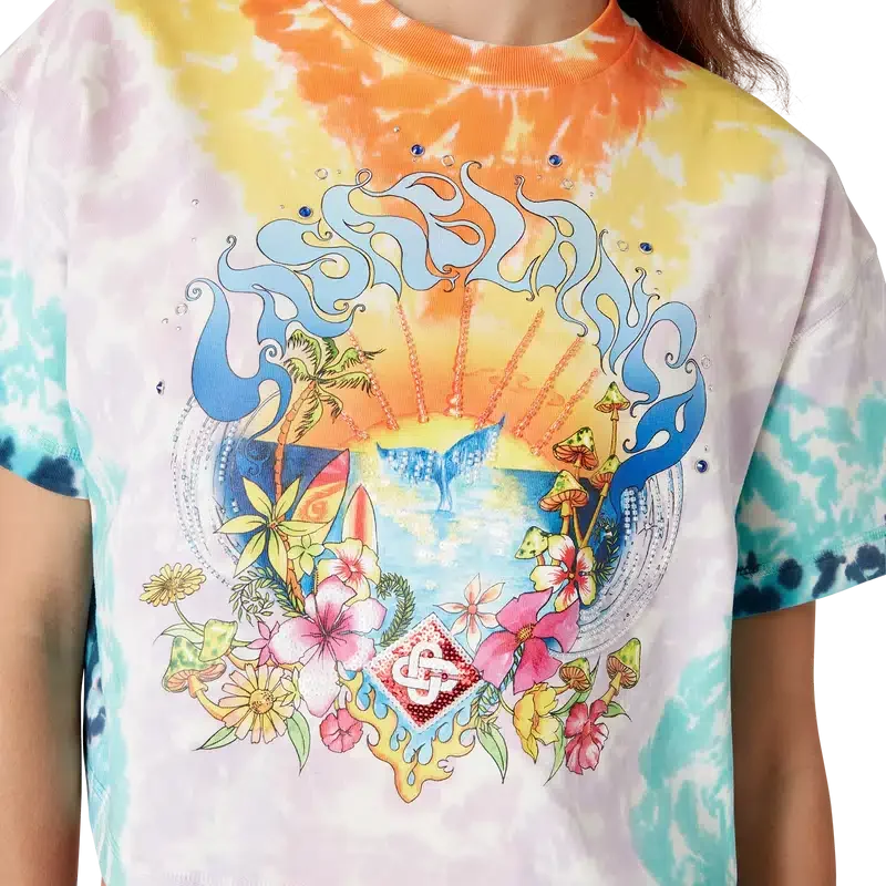 Surf Trip Tie Dye T-shirt är en kortärmad T-shirt med tryck, tillverkad av ekologiskt bomullstyg och med säsongsbetonat motiv inspirerat av den klassiska surfkulturen i Malibu, med typografi från den tiden på en tie-dye-bakgrund som anspelar på hippiekulturen. Avslutas med en klassisk ribbad rund hals. Designad för att sitta ovanför naveln.