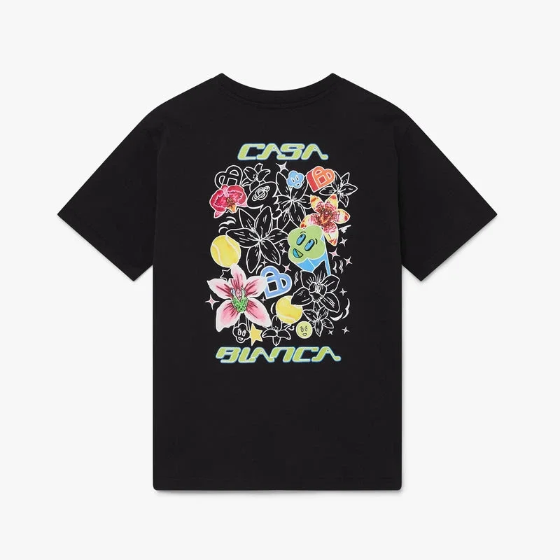 Den svarta kortärmade T-shirten med graffiti har en raffinerad design med säsongens graffitikonstverk som representerar ikonografin och designelementen för den nya säsongen, inklusive tolkningar av logotypen, smiley-ansiktet och orkidéblomman. Kompletterad med rund halsringning och en avslappnad silhuett.