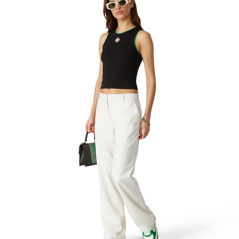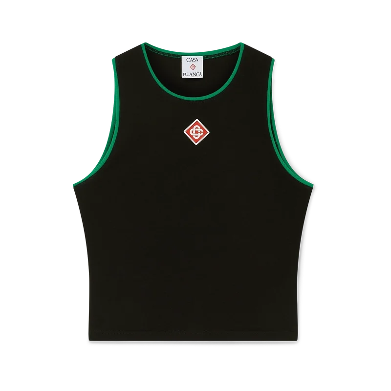 Tank-toppen med diamantlogotyp är en kort, ärmlös modell tillverkad i bomullstyg. Den kompletteras med märkets signaturdiamantlogotyp, gröna kantdetaljer och en klassisk rund halsringning. Designad för att sitta ovanför naveln.