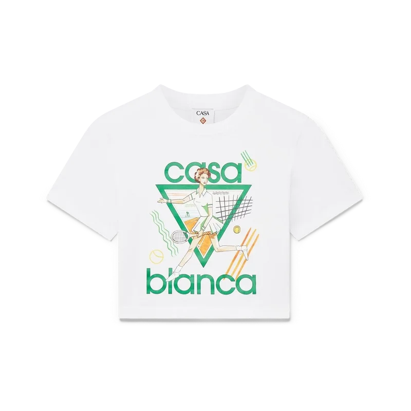Tennis Girl Baby T-shirt är en kortärmad T-shirt med tryck, tillverkad av en bomullsblandning, med husets säsongsbetonade konstverk inspirerade av den fortsatta studien av den klassiska skönheten och den samtida charmen i det antika Grekland. Avslutas med en klassisk rund hals – designad för att sitta ovanför naveln.