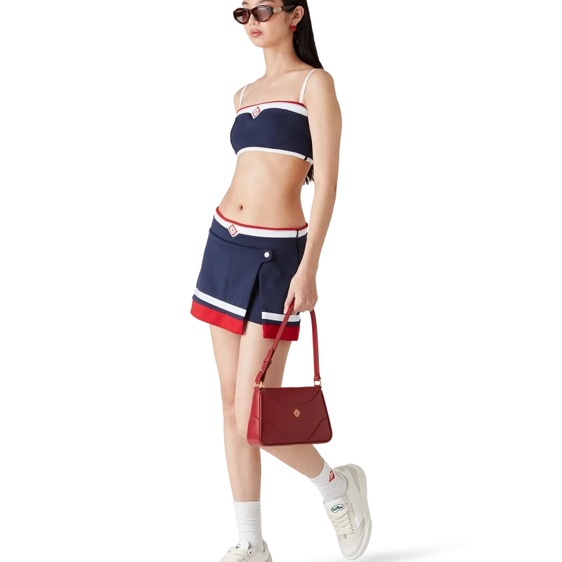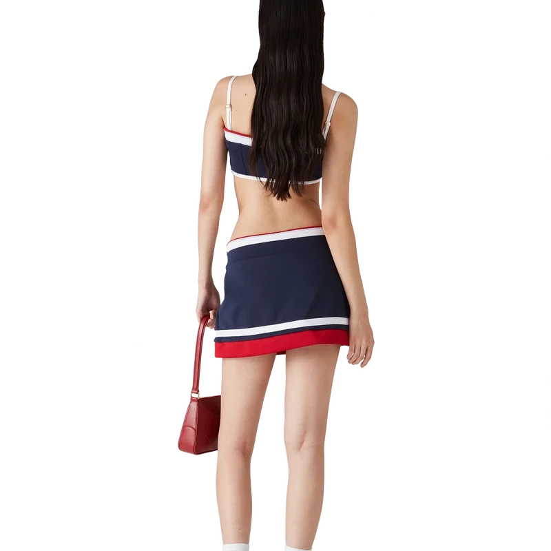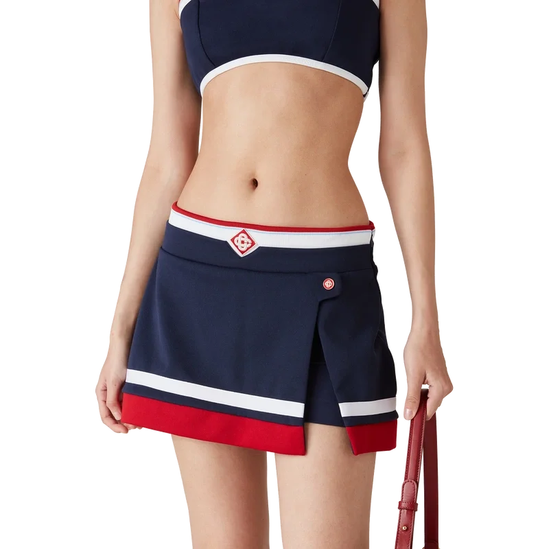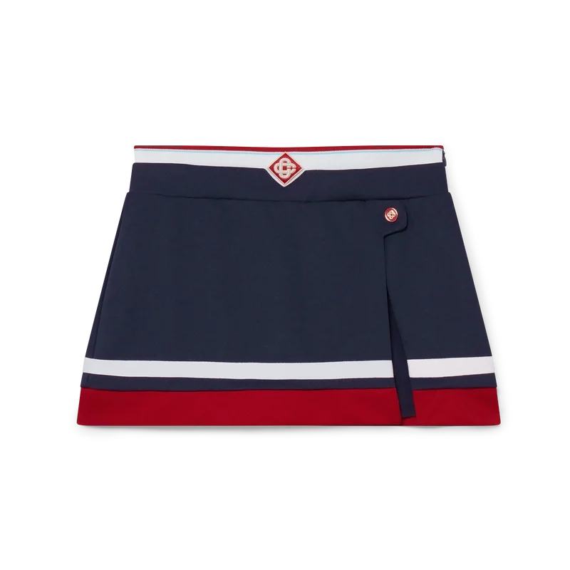 Tricot-minikjolen är en kort modell tillverkad av trikåtyg. Den har en midjeresår med märkets signaturdiamantlogo, inbyggda shorts, en slits och dragkedja i sidan.