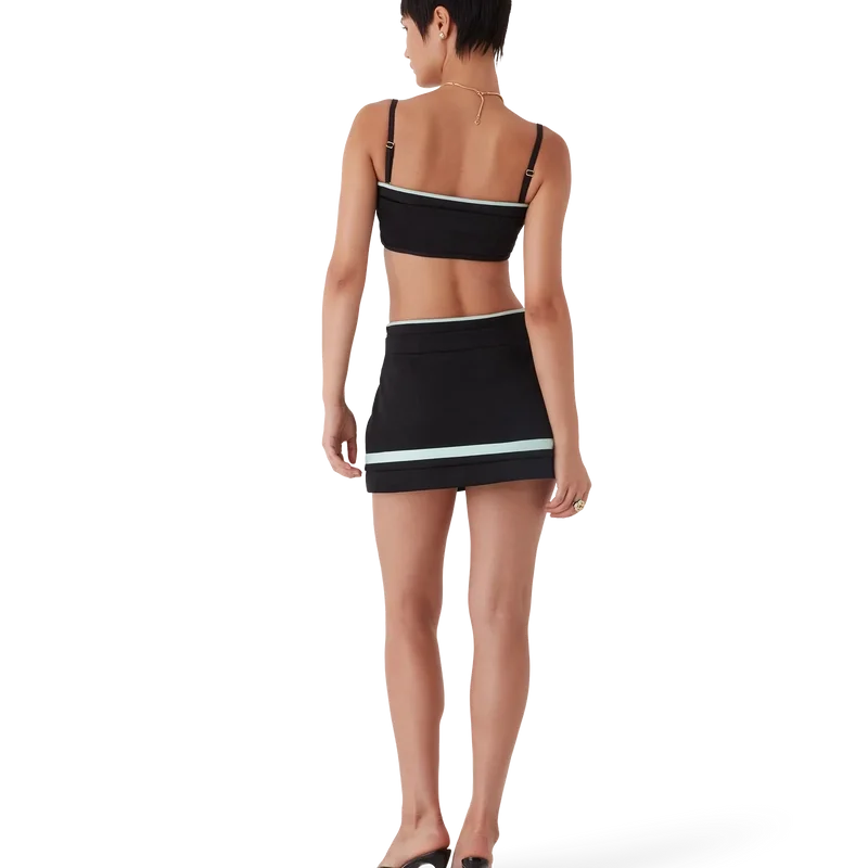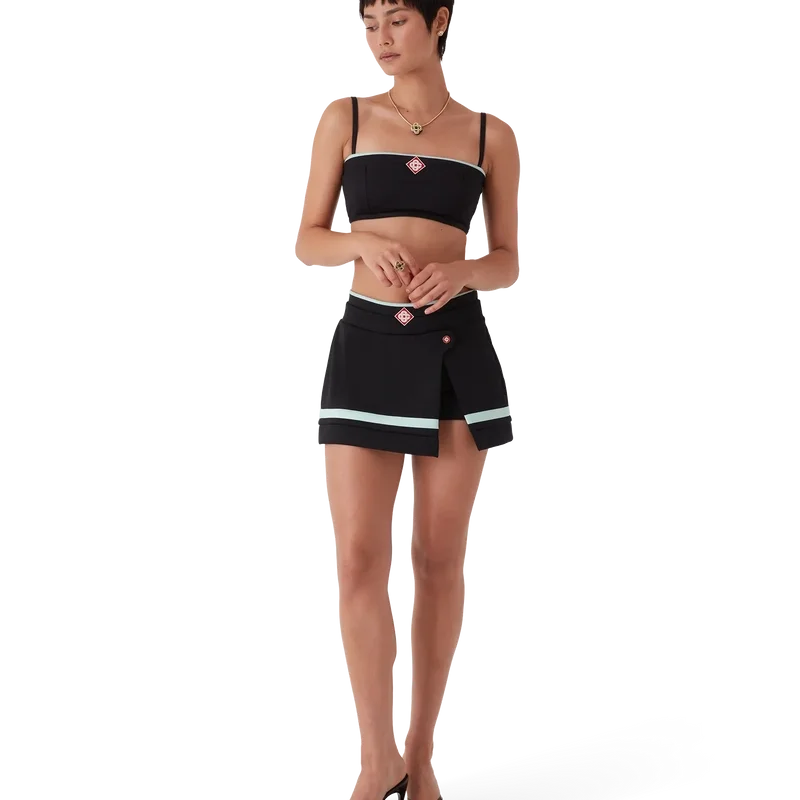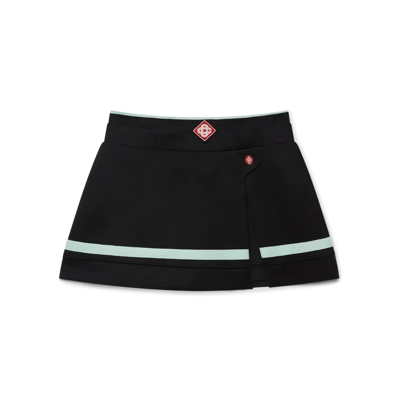 Tricot-minikjolen är en kort modell med sportinspirerad design och husets signaturmönster, Diamond Monogram, i mitten. Den har en ribbstickad midjeresår, en platt CC-logoknapp, inbyggda Shorts, en slits, en horisontell randig kant i svart, vitt, mintgrönt och rött samt dragkedja i sidan.