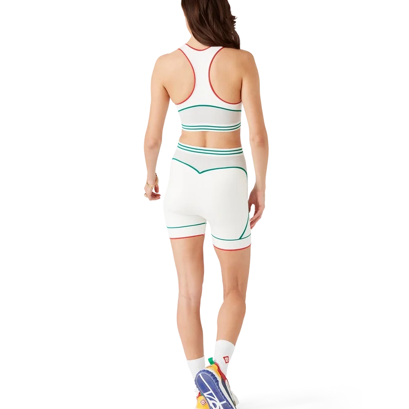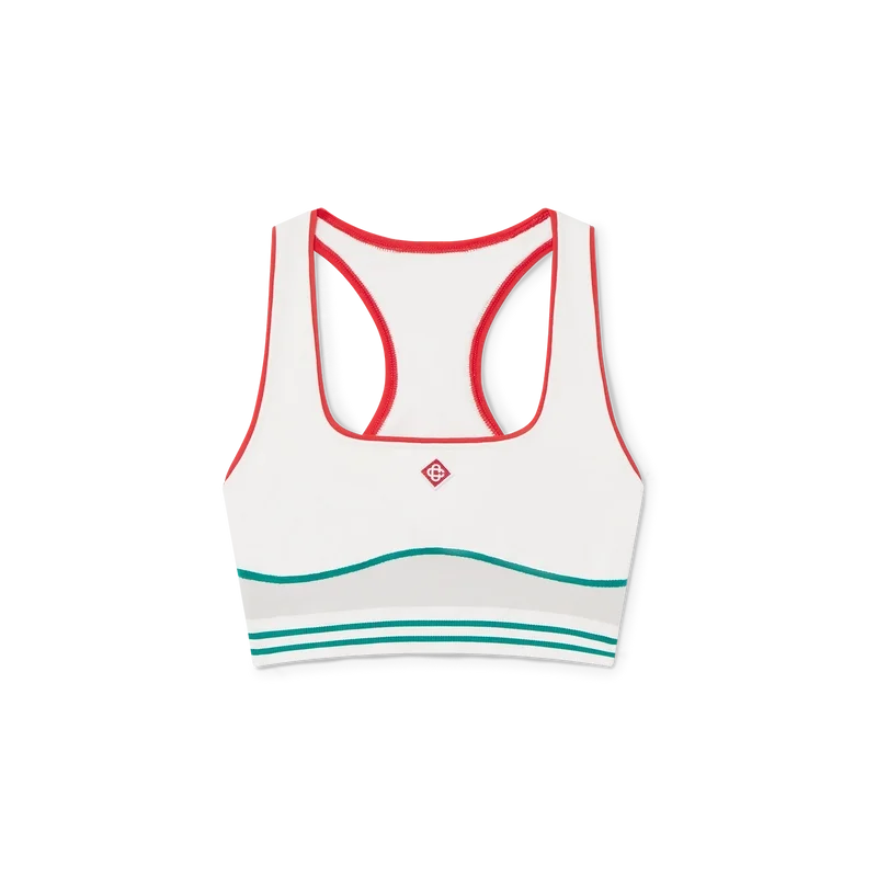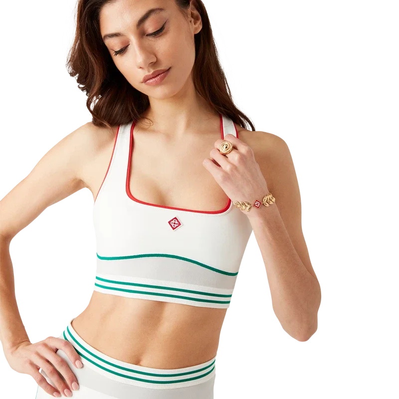 Den sömlösa sport-BH:n är en ärmlös modell inspirerad av sportkläder med husets signatur Diamond Monogram i mitten. Plagget är tillverkat av ett sömlöst ribbat stretchtyg med elastiskt band, kompletterat med axelband och rund halsringning.