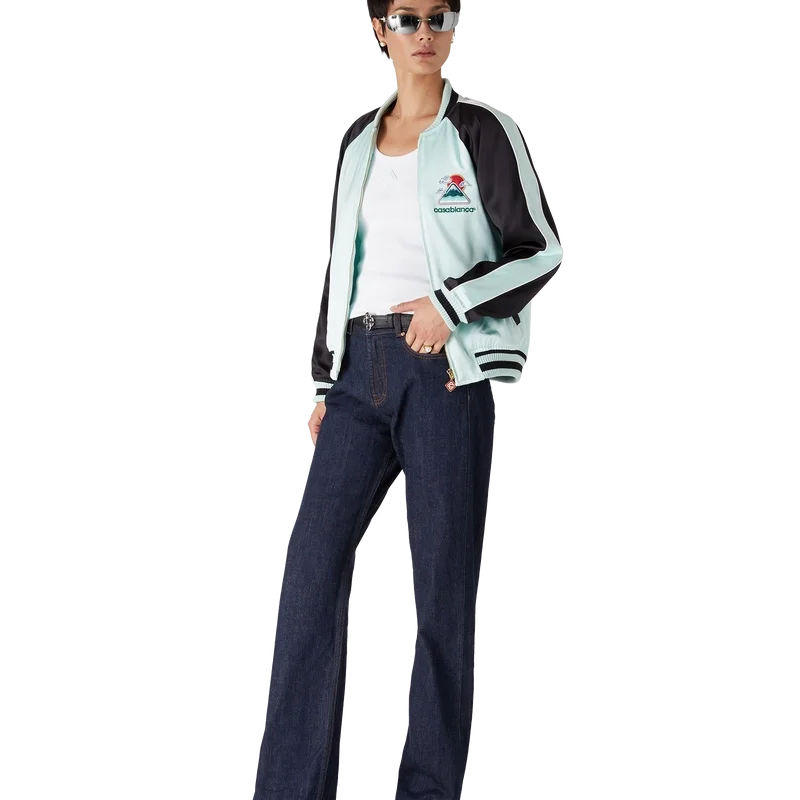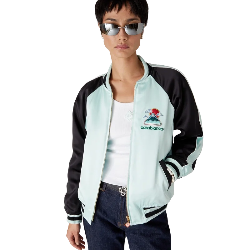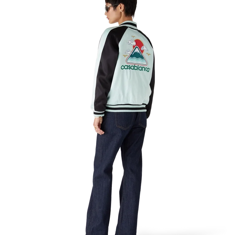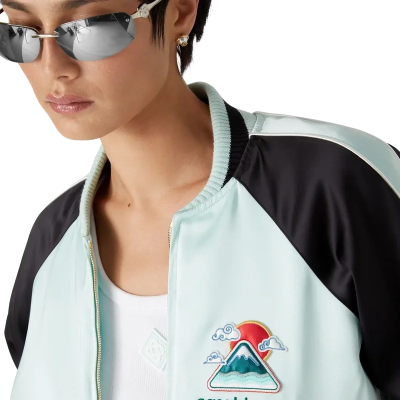 Den broderade bomberjackan i satin är en traditionell jacka i bomberstil, tillverkad av satintyg med konstverk inspirerade av Japans rika ikonografi. Den förmedlar ett starkt visuellt budskap med bara några få linjer och färger, vilket gör den till ett av kollektionens symboler. Den har dragkedja med märkets signaturdiamantlogotyp på dragkedjetappen, raglanärmar med gröna och svarta paneler och pipingdetaljer, foder, diagonala fickor och en ribbad ståkrage, manschetter och nederkant med mintgröna och svarta randdetaljer.