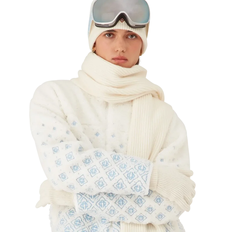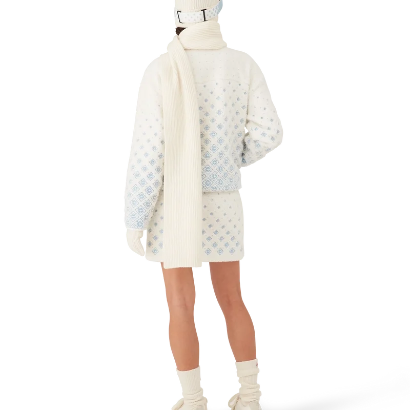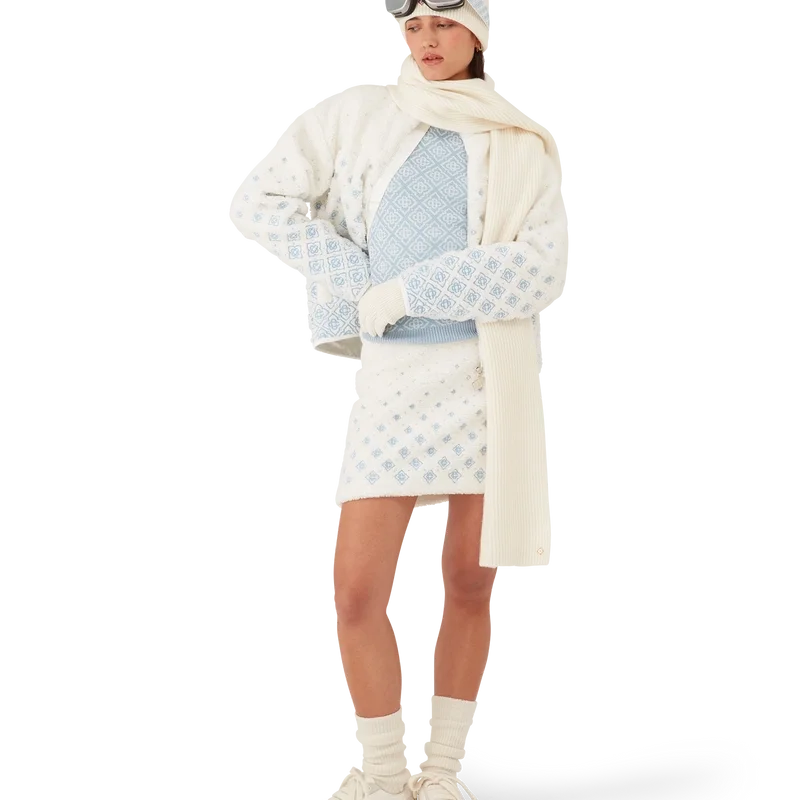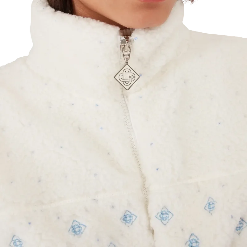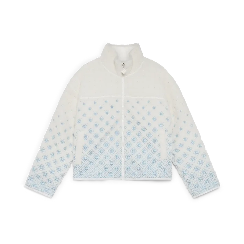 Den broderade korta fleecejackan med gradientmonogram är en raffinerad ytterplaggdesign tillverkad av tekniskt fleecetyg i vitt, inspirerad av den mjuka texturen hos Japans legendariska pudersnö. Den hämtar inspiration från den inbjudande komforten i det traditionella landsbygdslivet, där ångande varma källor erbjuder en paus från vinterkylan och mjukt snöfall dämpar omvärlden.