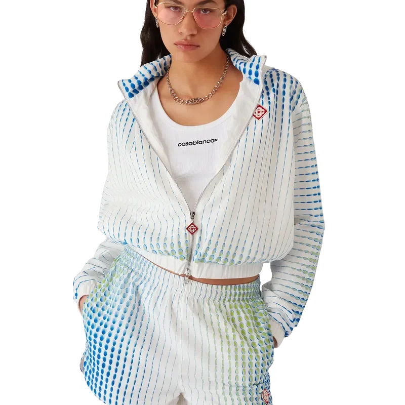 Dots Windbreaker Jacket är en sportig design tillverkad av ett tekniskt tafttyg med husets signaturkonstnärlighet, med gradientmotiv och textureffekter. Kompletterad med långa ärmar, en huva med dragsko, elastiska muddar och nederkant, en dragkedja med husets signaturdiamantdragkedja och husets diamantlogo.