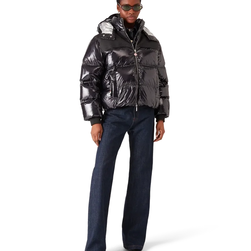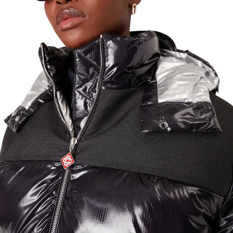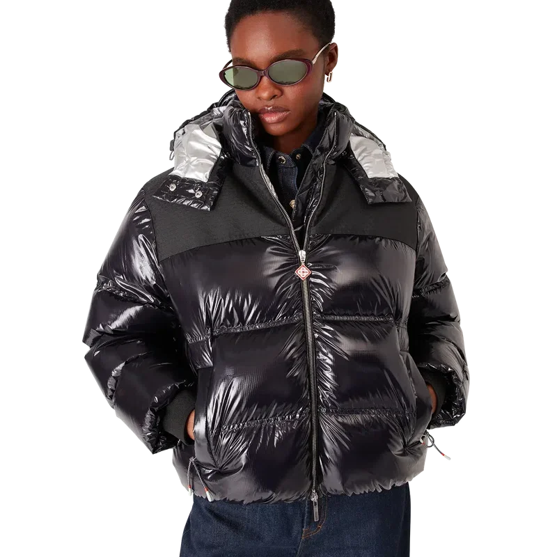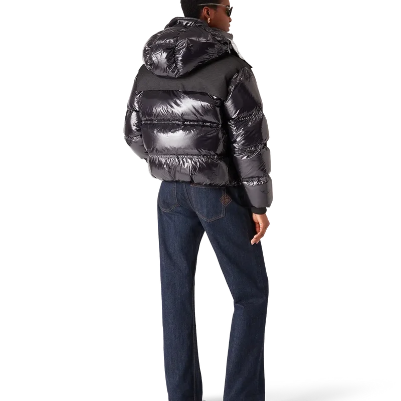 Nylon-dunjackan är en modern, boxig ytterplaggdesign tillverkad av ripstop-nylon med dunfyllning och kontrasterande monogram-jacquardpanel över axlarna. Kompletterad med en huva med CC-logotypknappar och dragsko, en ståkrage som ger extra värme och skydd mot väder och vind, dragkedja med husets signaturdiamantlogotyp, framfickor med dragkedja, justerbara manschetter med märkeslogotyp samt elastisk nederkant och manschetter.