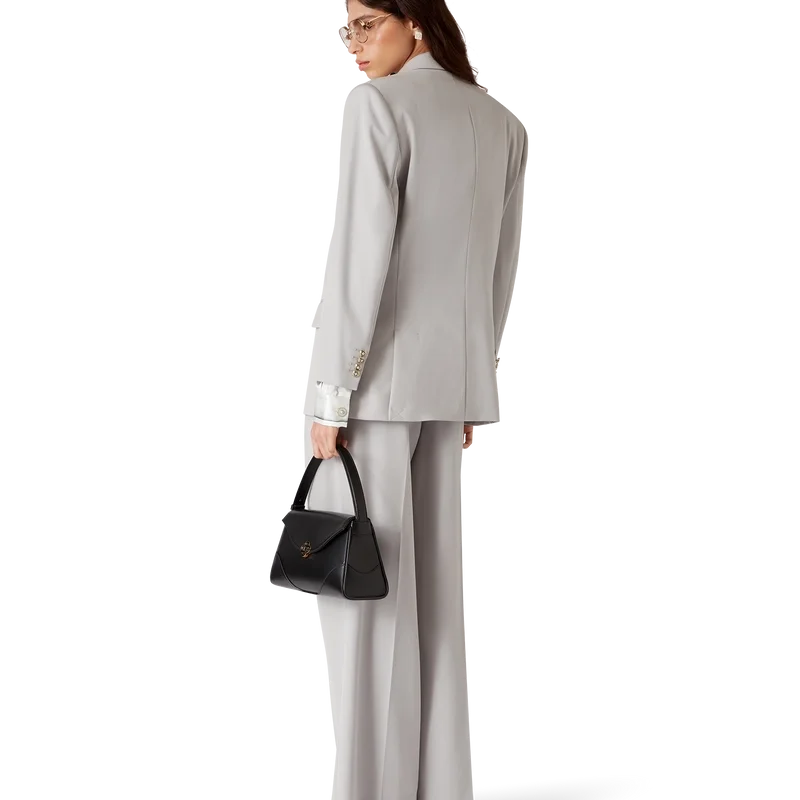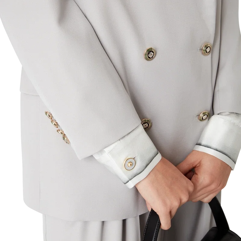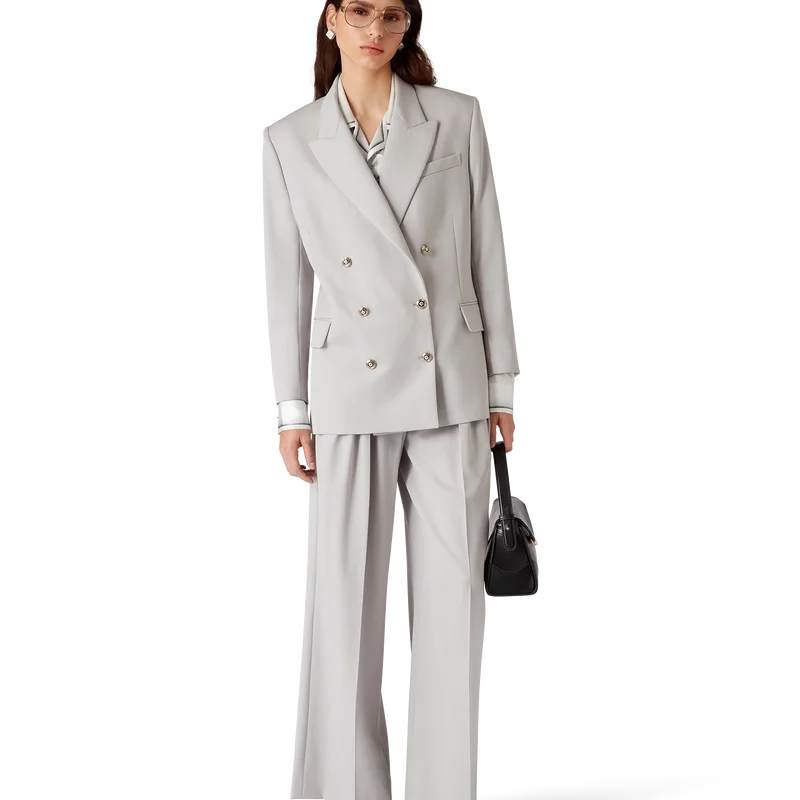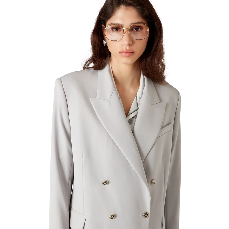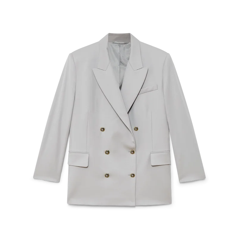 Den oversized blazern i ull är en dubbelknäppt modell inspirerad av Pat Riley. Det omvälvande inflytande som den legendariske Lakers-tränaren hade på basketstilen under 80- och 90-talet återspeglas i kollektionens skräddarsydda sportkläder, tillverkade av nyullstyg. Kompletterad med spetsiga slag, knäppning, platta CC-emaljknappar, en bröstficka med kant och fickor med lock fram.
