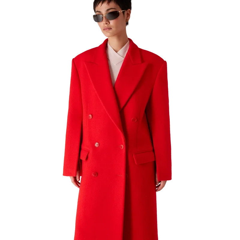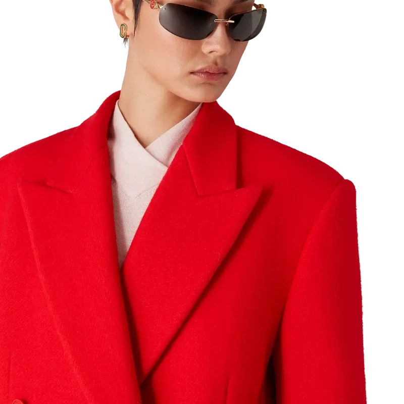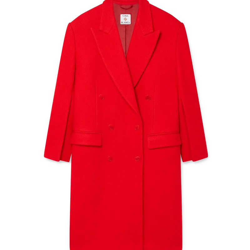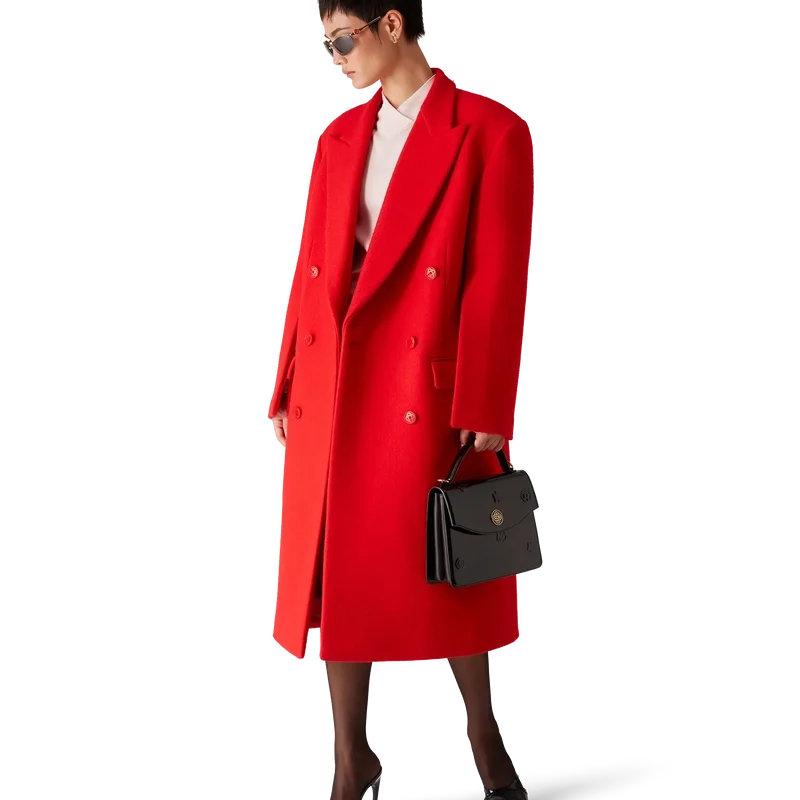 Den skräddarsydda överrocken har en klassisk dubbelknäppt design. Den är försedd med spetsiga slag, fickor med lock, knäppning, sammankopplade knappar av corozo, foder, slits och långa ärmar med veck längs underärmarna.