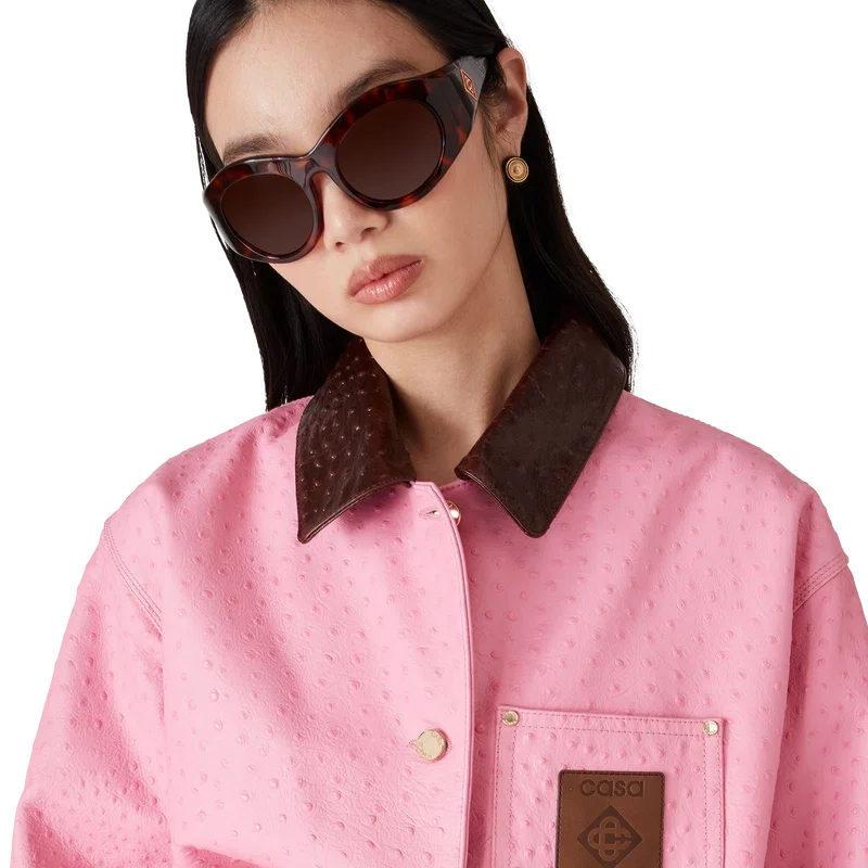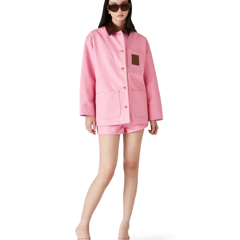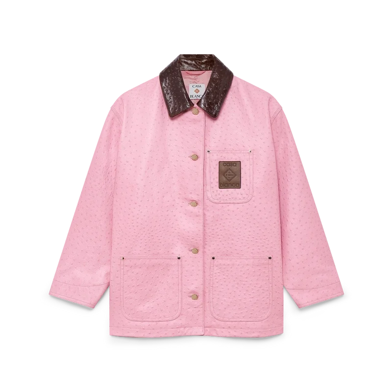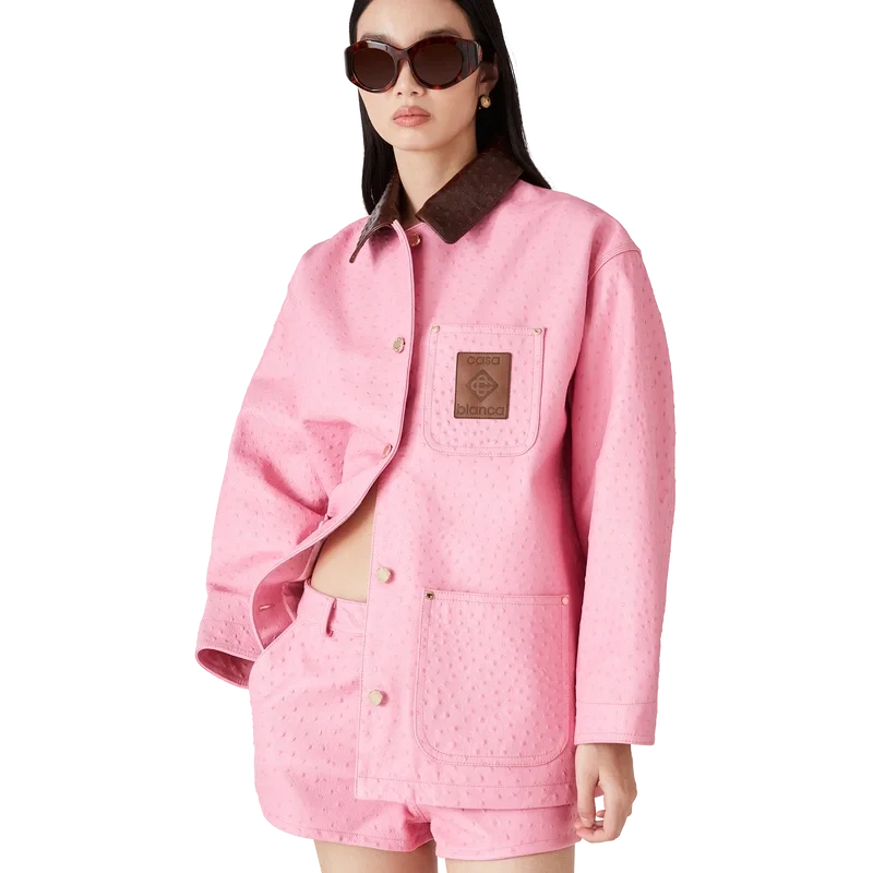 Den präglada läderkavajen i arbetsklädstil har en avslappnad och ledig design och är tillverkad av italienskt kalvskinn. Den har ett tryckt mönster med strutsmönster, en kontrastkrage, en bröstficka med en läderlapp med märkeslogotyp, påsydda fickor fram, knäppning och guldpläterade detaljer.