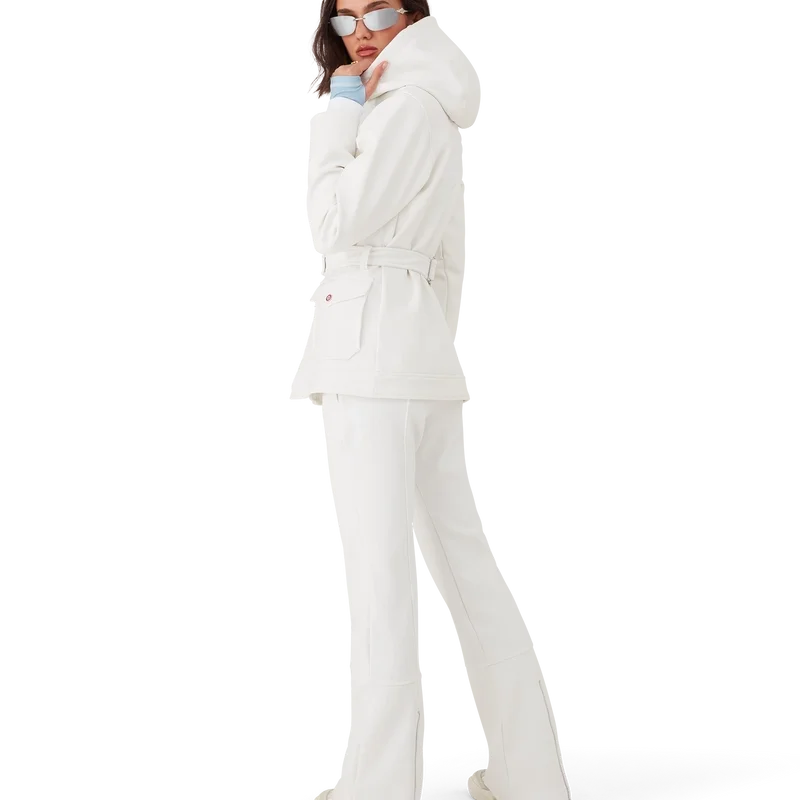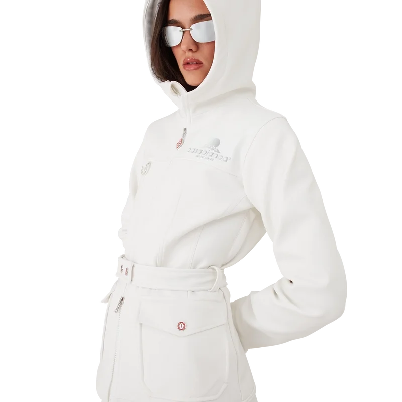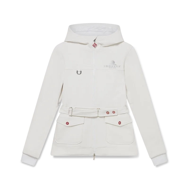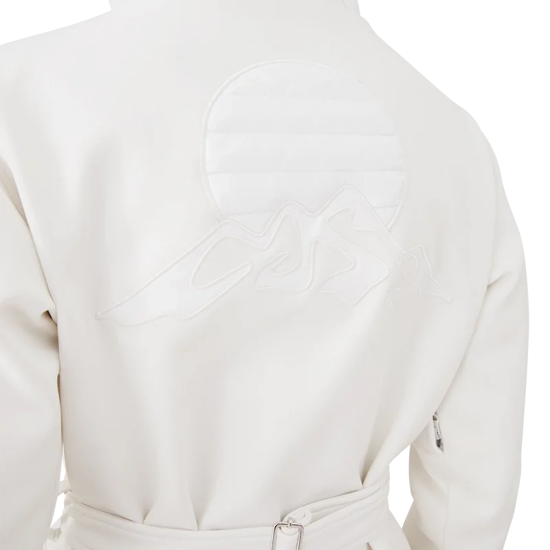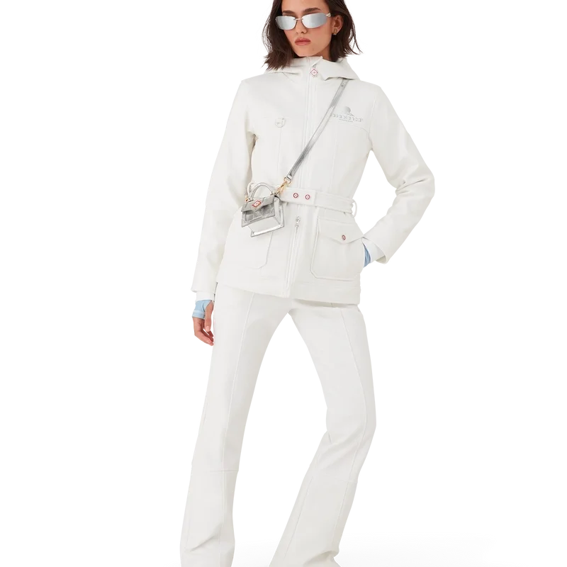 Skidjackan är en raffinerad ytterplaggdesign tillverkad av fleecetyg i vitt, inspirerad av de mjuka texturerna i Japans vinterlandskap. Med frusna landskap och snötäckta bambuskogar som skapar fridfulla vita korridorer. Denna modell har husets säsongsbetonade Casa Montagne-konstverk på ryggen. Kompletterad med en huva med Cc-logotypknappar och dragsko, en ståkrage som ger extra värme och skydd mot väder och vind, dragkedja med husets signaturdiamantlogotyp, framfickor med silverfärgade knäppen, justerbara bälten med märkeslogotyp samt elastisk nederkant och muddar.