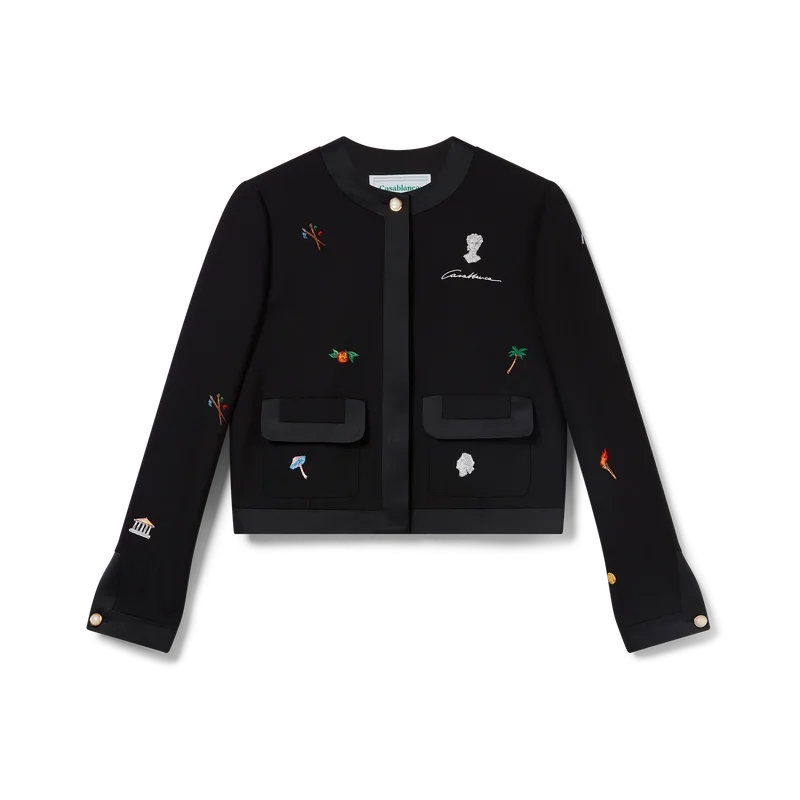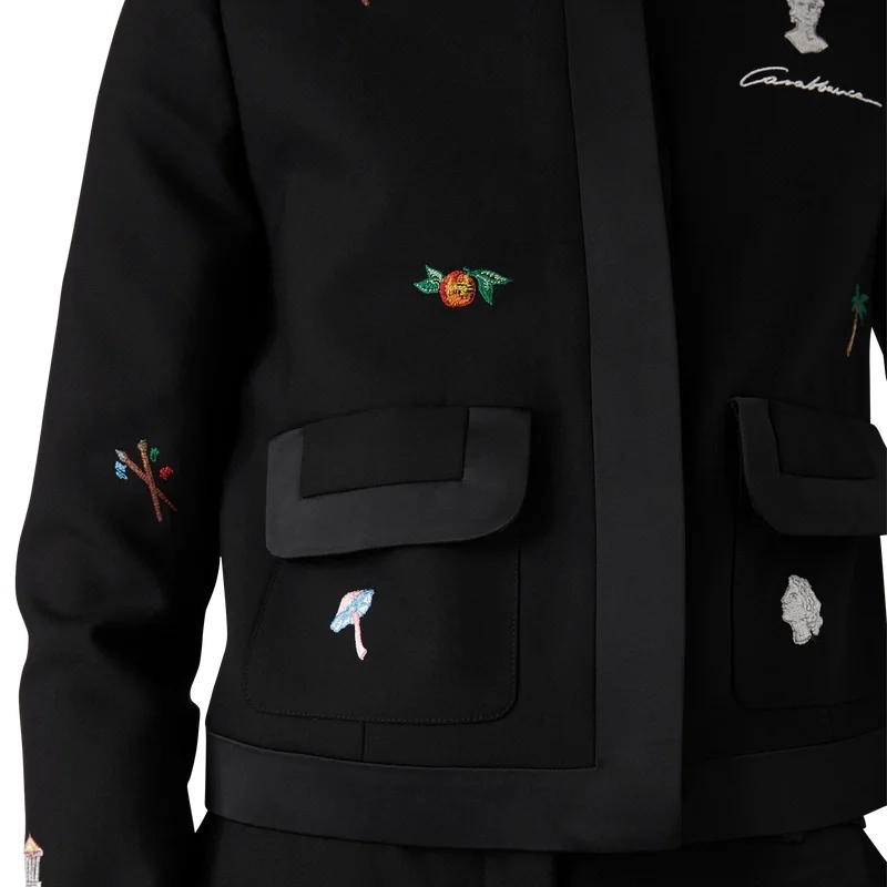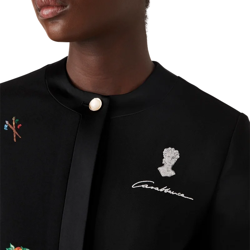 Den skräddarsydda jackan i ull med broderat motiv är en kort modell tillverkad av broderat ulltyg. Den är försedd med broderade motiv som representerar husets symbolik med natur och arkitektur, fickor, foder, guldkantade pärlknappar vid halsen, knäppning, kantdetaljer vid halsen, knäppning, fåll och fickor.