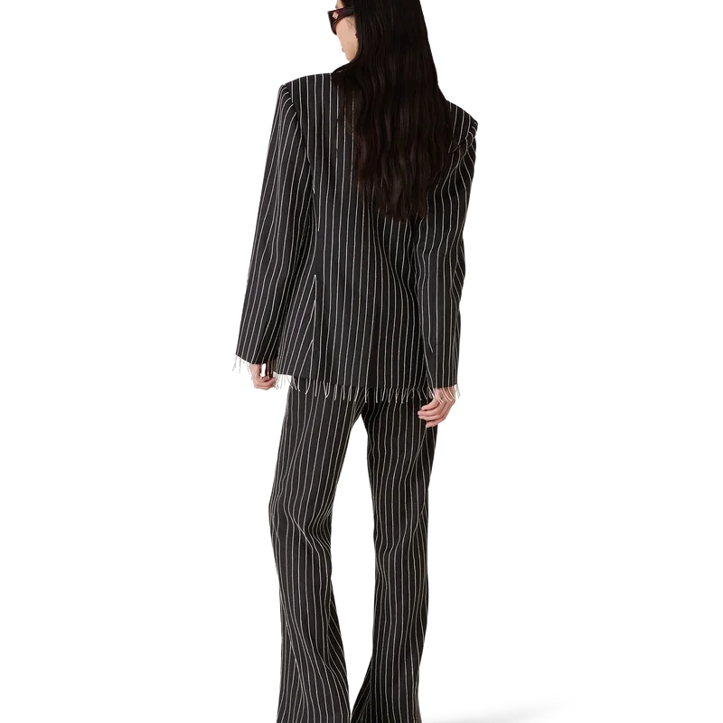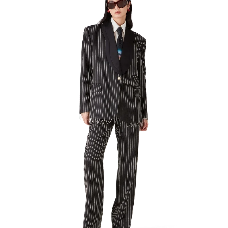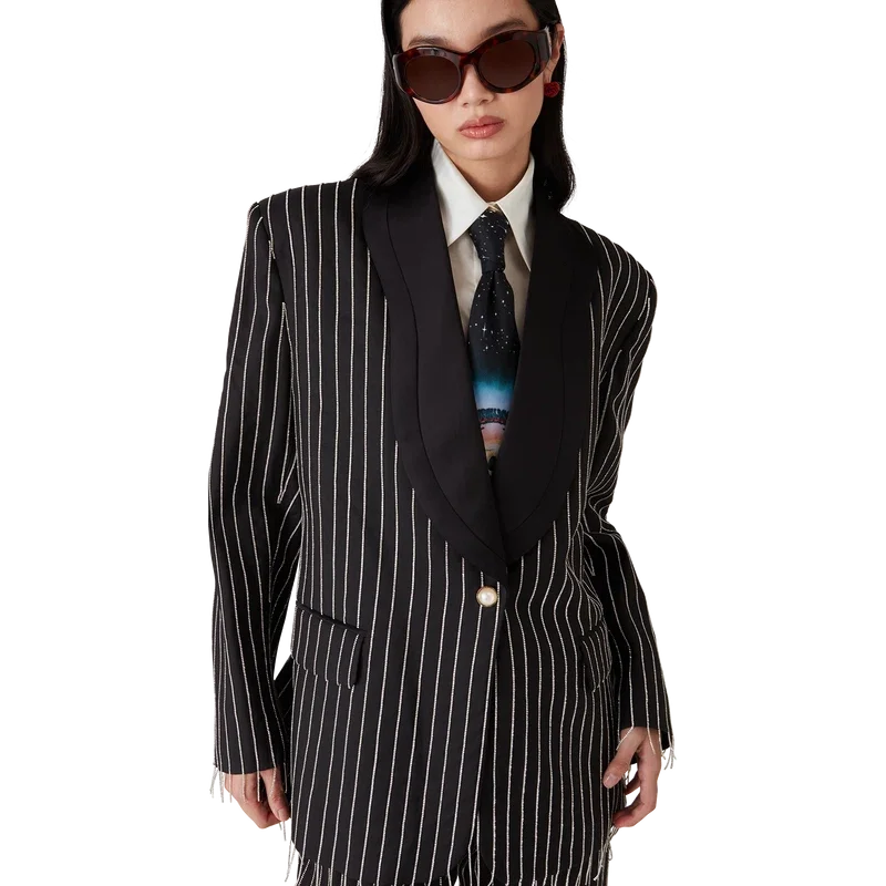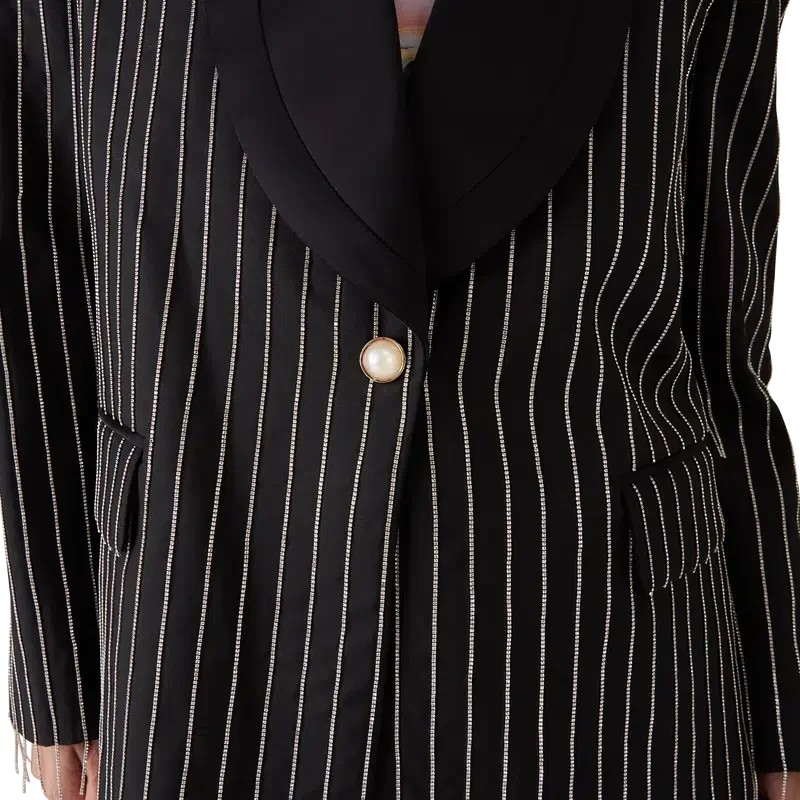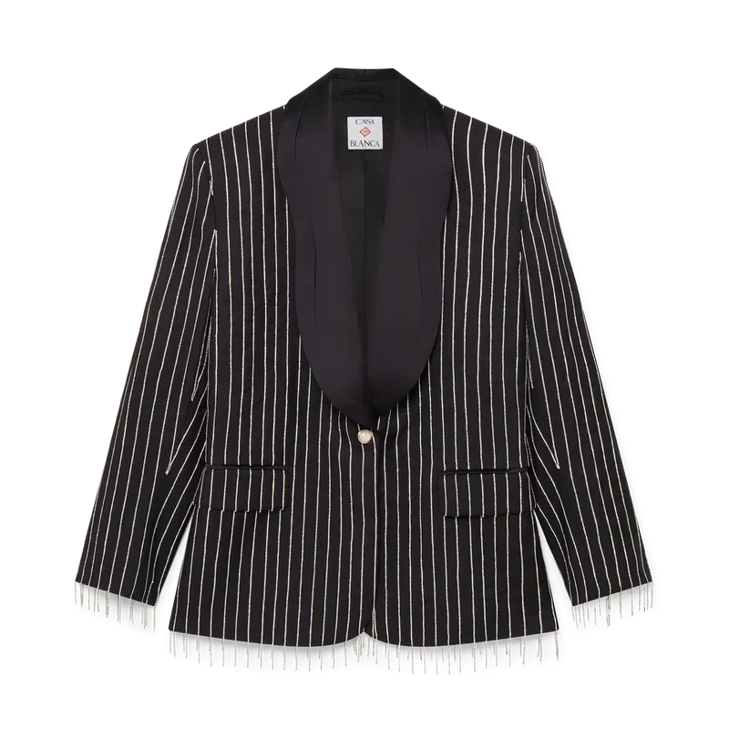 Den kristallprydda skräddarsydda jackan är en enkelknäppt modell tillverkad av skräddarsytt siden och kristaller. Den har knäppning, en signaturknapp med guldkant och pärla, fickor med lock fram, en slits bak, revers och foder.