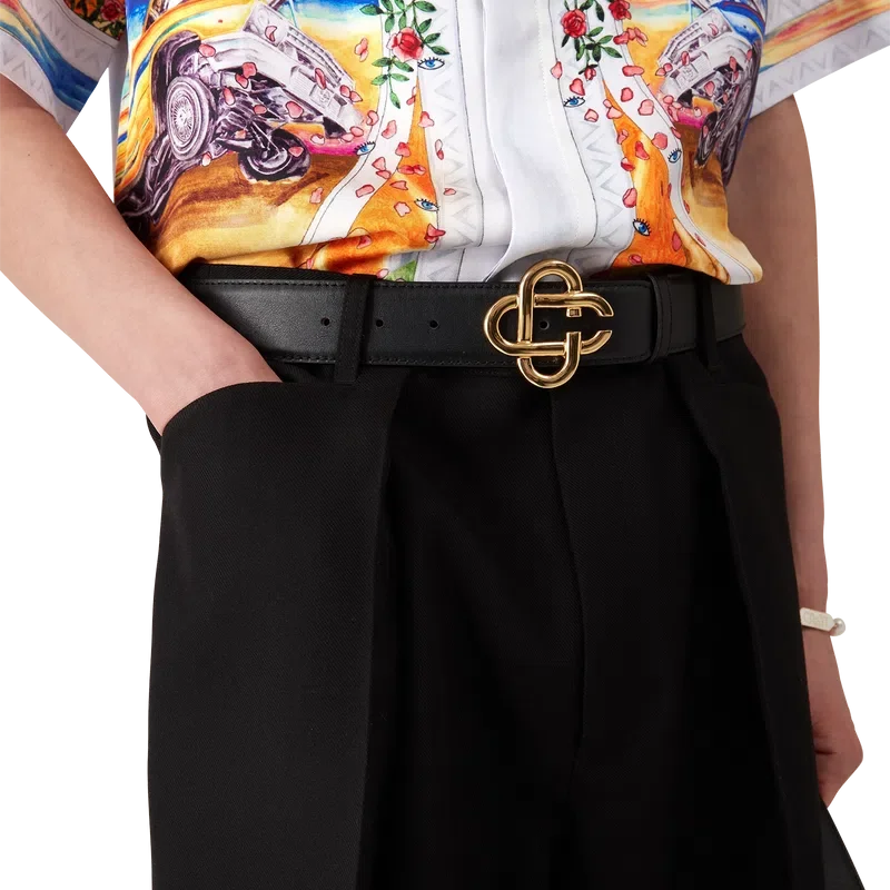 Det svarta Cc-logobältet har en rem tillverkad av italienskt getskinn. Kompletterat med husets signaturspänne med sammanflätade Cc-bokstäver, tillverkat av guldpläterad mässing.