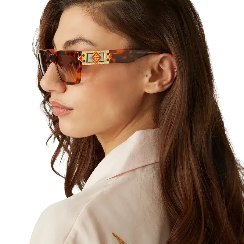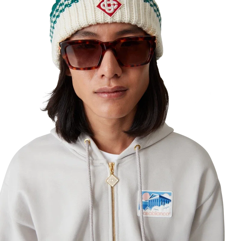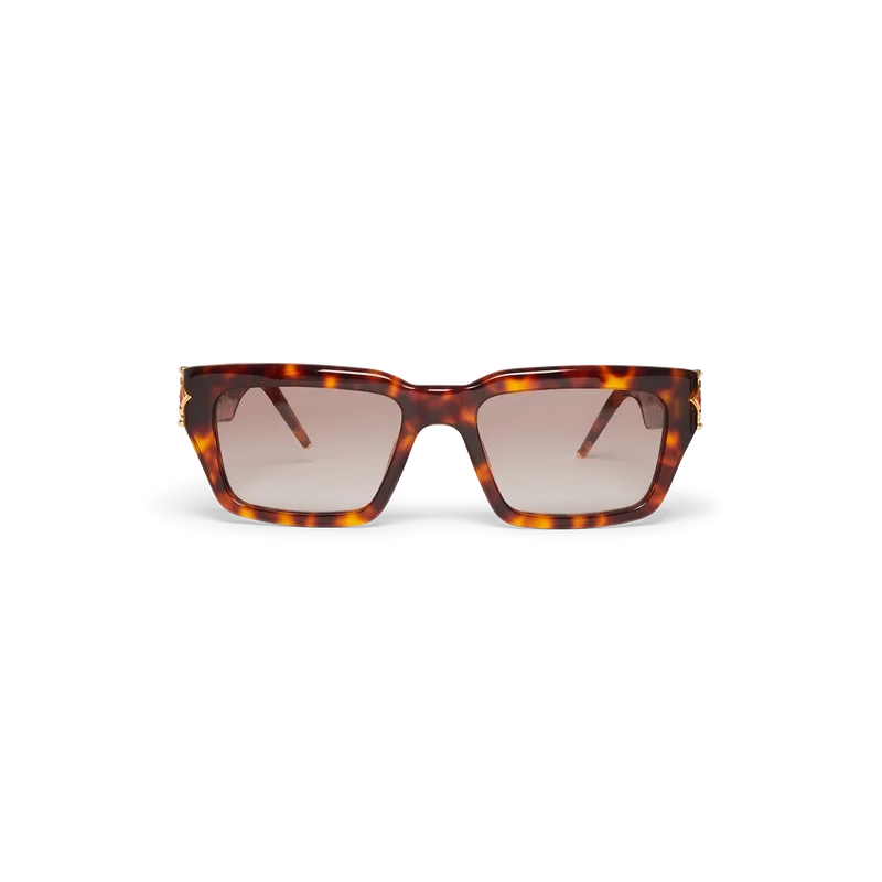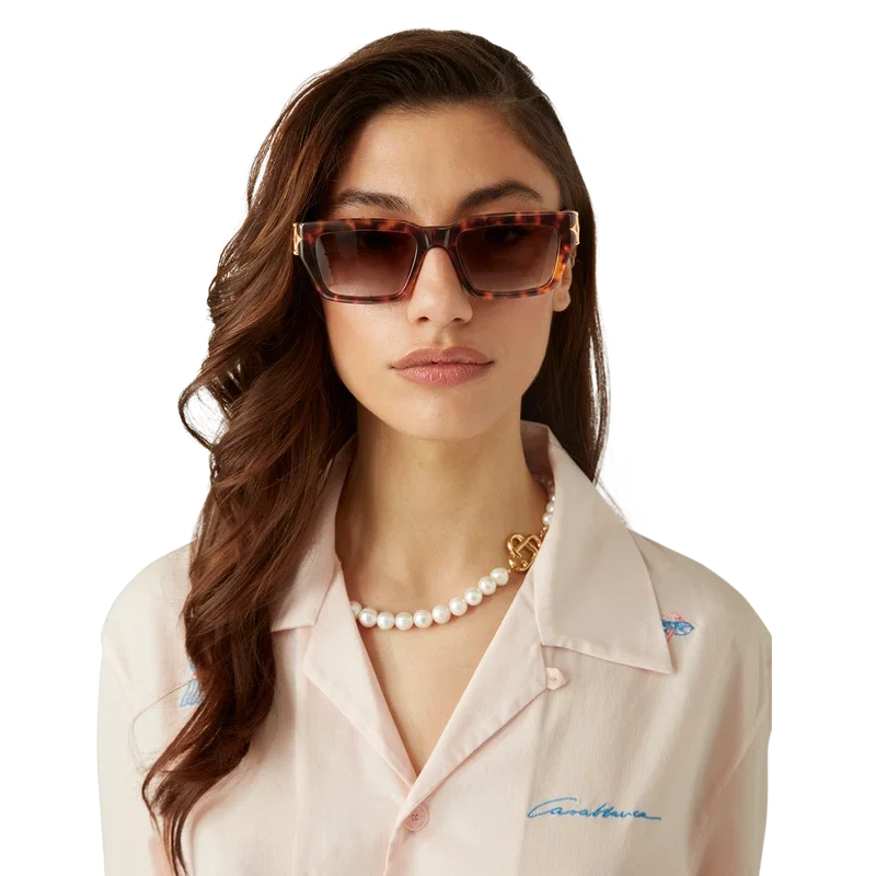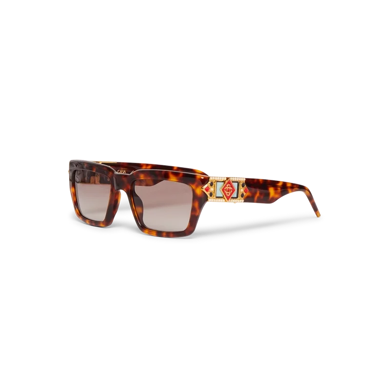 Solglasögonen Tortoiseshell Square Metope har en fyrkantig design tillverkad av acetat och guldpläterad mässing. Här är Casablancas signatur Diamond Monogram placerad på skalmarna. Linserna ger 100 % UV-skydd och modellen levereras komplett med en Casablanca-ask, rengöringsduk och garantibroschyr.