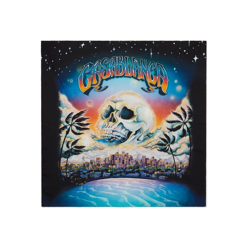 La Pramonition stor silkescarf är ett tryckt mönster tillverkat av silketwilltyg med husets säsongsbetonade konstverk av en kuslig vision av La:s silhuett på natten, med UFO-element som anspelar på vintage-inspirerad science fiction. Avslutas med en svart kant.