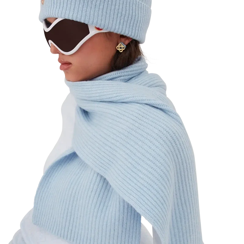 Skidscarf är en raffinerad design tillverkad av ribbstickad ull i vitt, inspirerad av den orörda pudersnön som täcker de lantliga byarna på Hokkaido i Japan. Designen för tankarna till frostbelagda bambuskogar och bondgårdar inbäddade i alpina dalar och förkroppsligar husets Apras-Sport-koder med sin precisa konstruktion.
