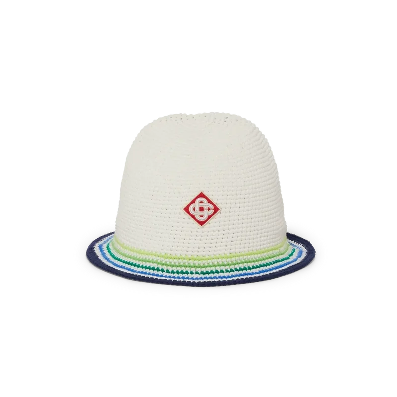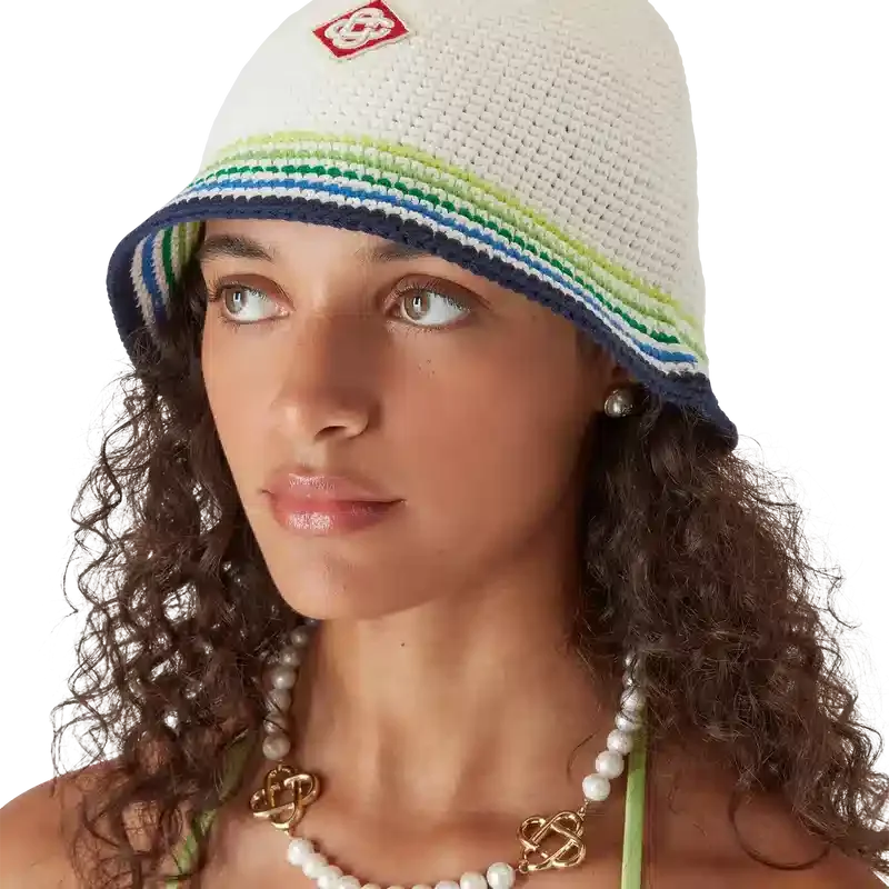 Beach Club Cap är en elegant hatt i bucket-stil tillverkad av virkat bomullstyg med husets signaturdiamantlogo i mitten. Avslutas med en randig brätte i blått, grönt, gult och vitt.