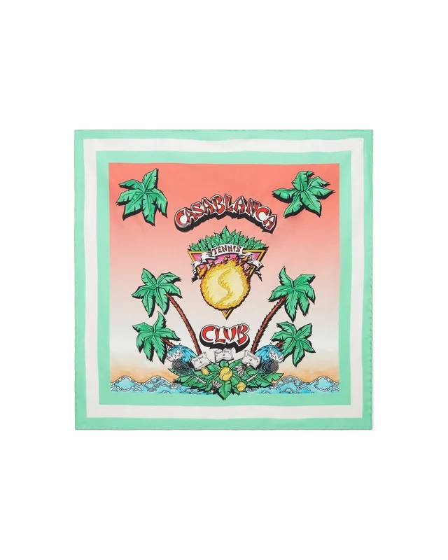 Tennis Club Medium Silk Scarf är en tryckt design tillverkad av silketwilltyg med husets säsongsbetonade konstverk omtolkat i ett surftema i stil med en grafisk skiss ritad med tuschpennor. Avslutas med en grön- och vitrandig kant.