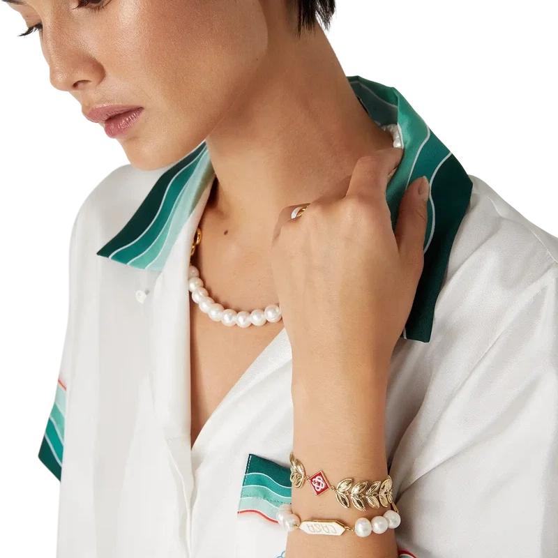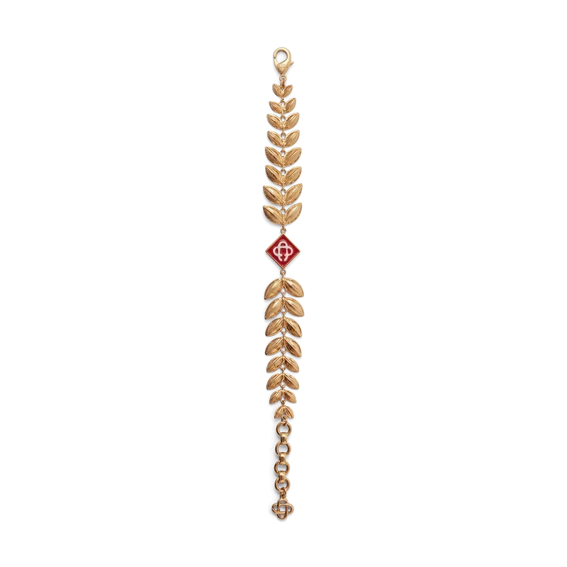 Armbandet med guldlagerblad har husets signaturmotiv med lagerblad och diamantlogotyp, tillverkat av mässing och handmålad emalj. Kompletterat med en guldpläterad kedja och karbinlås – detta smycke levereras med en presentask, dammpåse med märkeslogotyp och produktbroschyr.