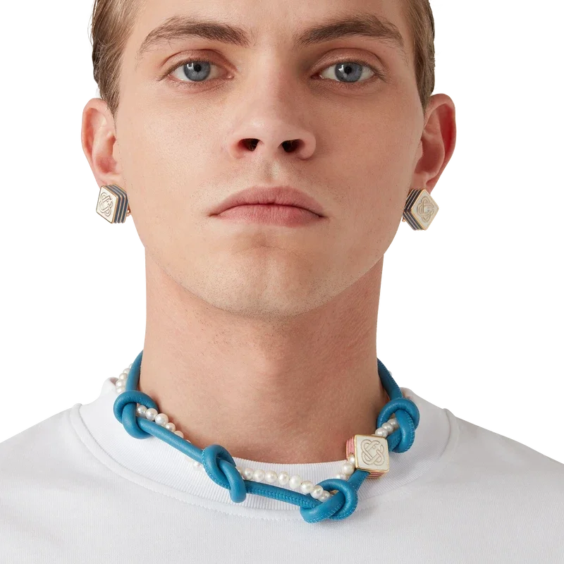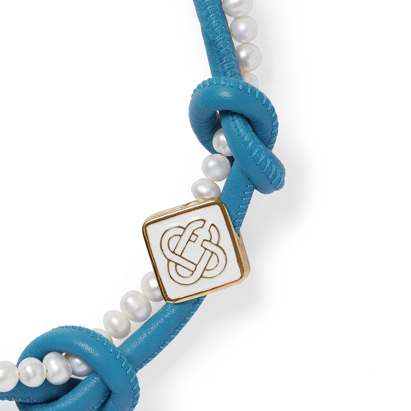 Det blå knutna halsbandet är tillverkat av läder och sötvattenspärlor och pryds av husets signaturdiamantlogo. Kompletteras med guldpläterat karbinlås och kedja.<!–