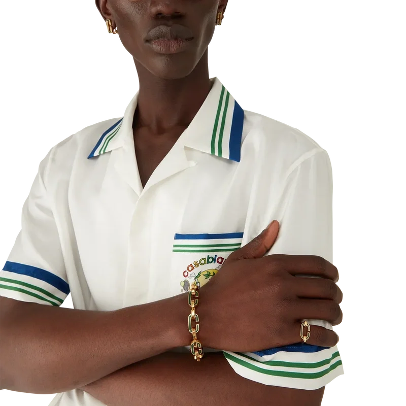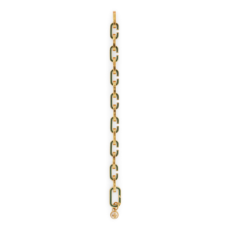 Armbandet med C-länkar är tillverkat av guldpläterad mässing och emalj. Kompletterat med en guldpläterad kedja med gröna, handmålade emalj-C-länkar.