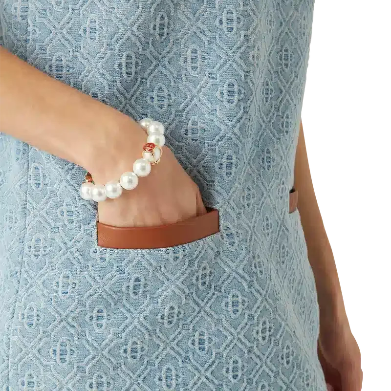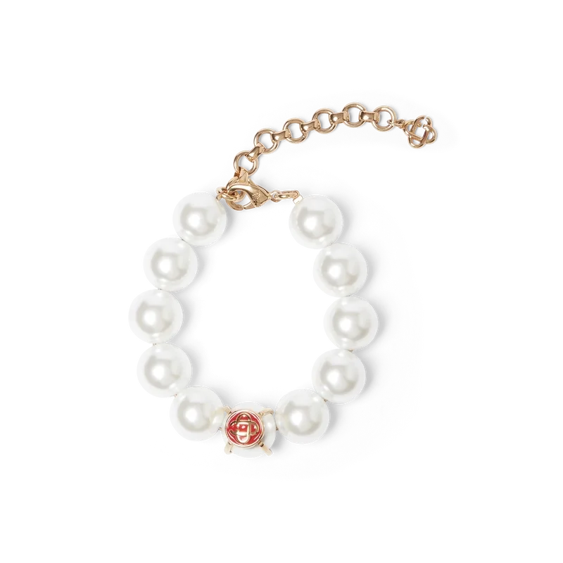 Caged Pearl-armbandet är tillverkat av guldpläterad mässing och imiterade glaspärlor och pryds av husets signaturdiamantlogo. Det kompletteras med en guldpläterad kedja och karbinlås – detta smycke levereras med en presentask, en dammpåse med varumärket och en produktbroschyr.