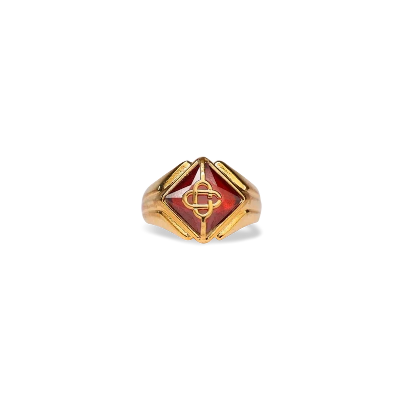 Casa Signet-ringen är tillverkad av guldpläterad mässing och kristaller. Den är prydd med husets sammanflätade Cc-diamantlogotyp och målade detaljer på ringbandet – denna ring levereras med en presentask, dammpåse och produktbroschyr.