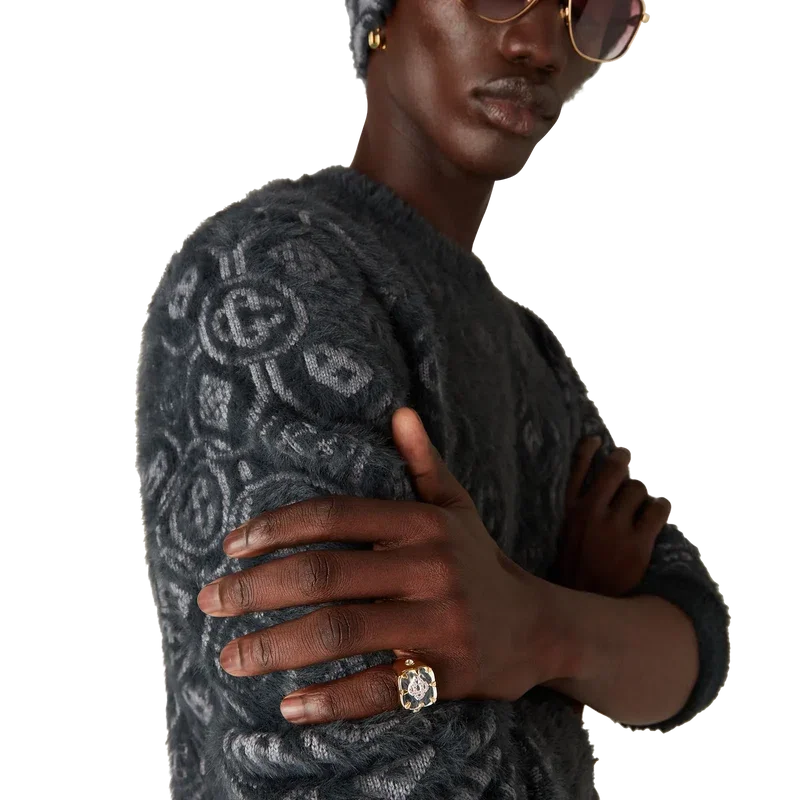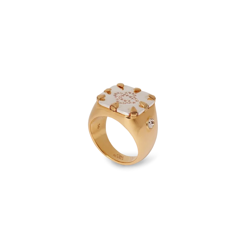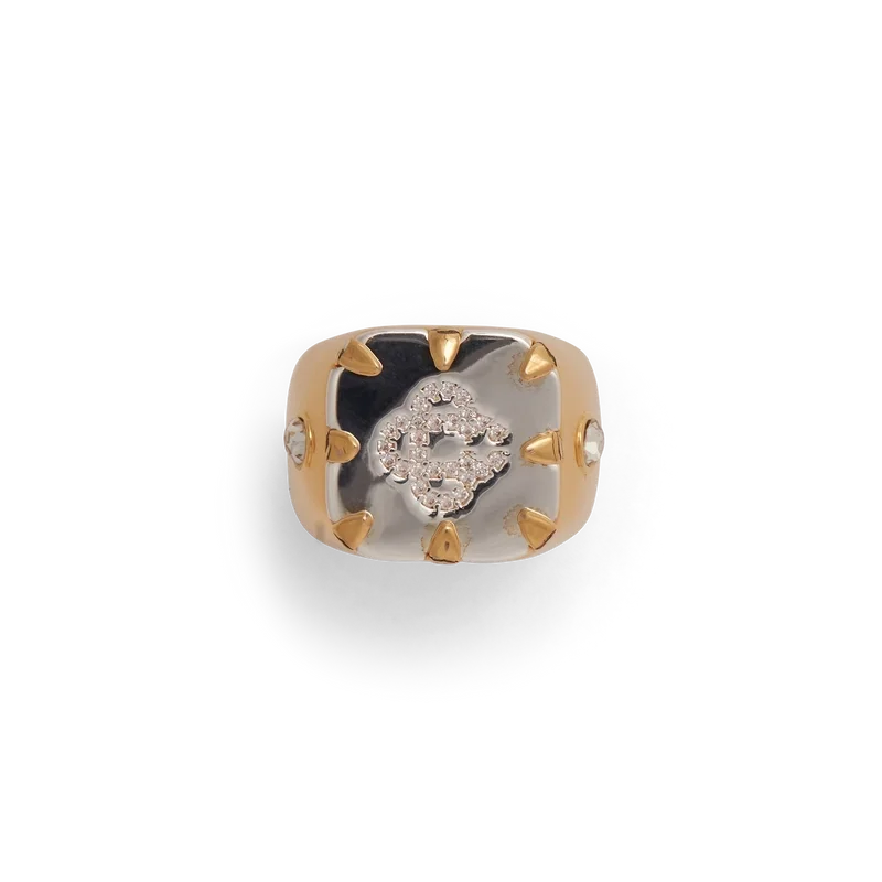 Cc-logotypens signetring är tillverkad av guldpläterad mässing, silver och kristaller. Den kompletteras med husets signaturdetalj, den sammanflätade Cc-logotypen, på huvudet, prydd med kristaller, och ringstammen har en kristall på varje sida.