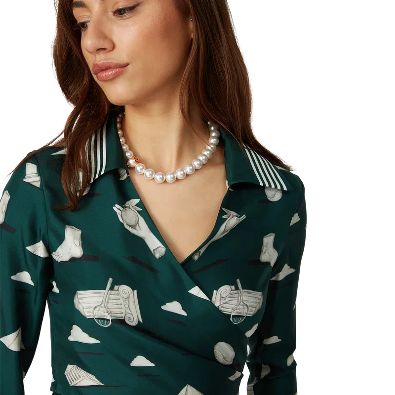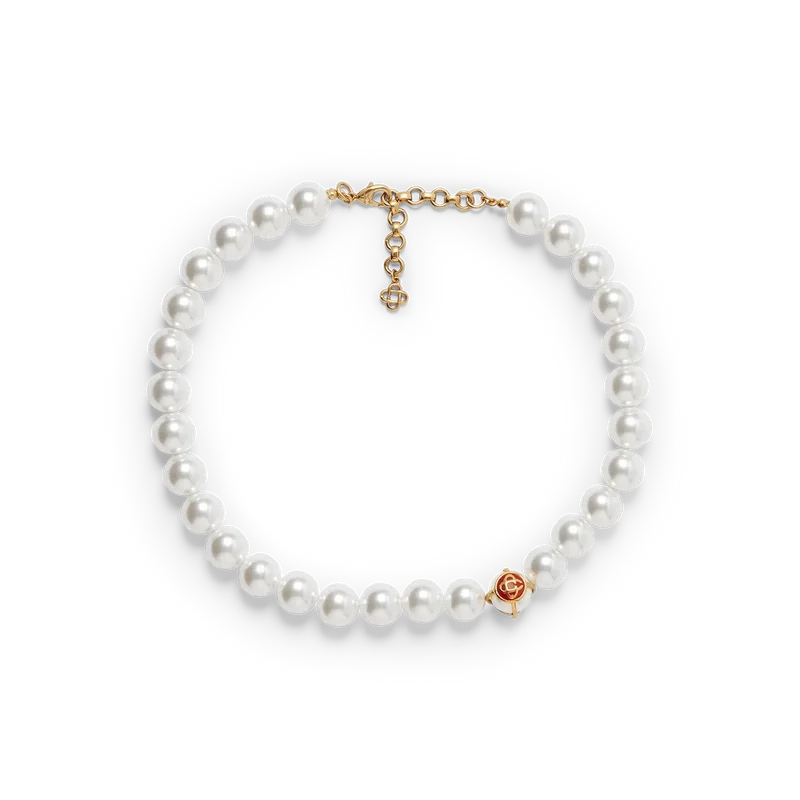 Halsbandet med burpärlor är tillverkat av guldpläterad mässing och imiterade glaspärlor och har husets signaturdiamantlogo. Kompletterat med en guldpläterad kedja och karbinlås – detta smycke levereras med en presentask, en damaspåse med varumärket och en produktbroschyr.