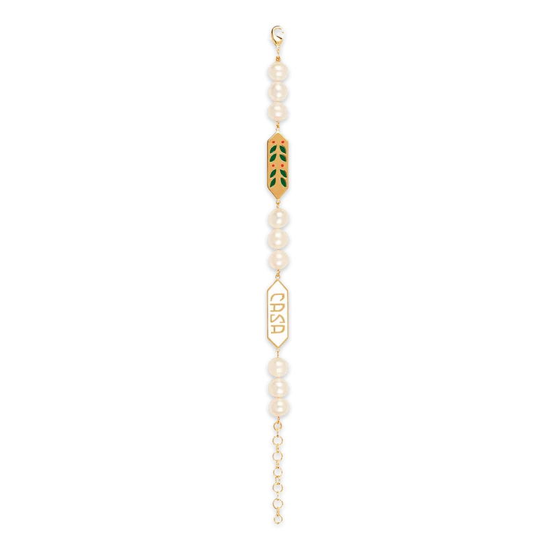 Laurel Pearl-armbandet pryds av husets signaturmotiv med lagerblad och diamantlogotyp. Tillverkat av sötvattenspärlor, mässing och handmålad emalj. Kompletterat med en guldpläterad kedja och karbinhake. Detta smycke levereras med en presentask, damaskpåse med märkeslogotyp och produktbroschyr.