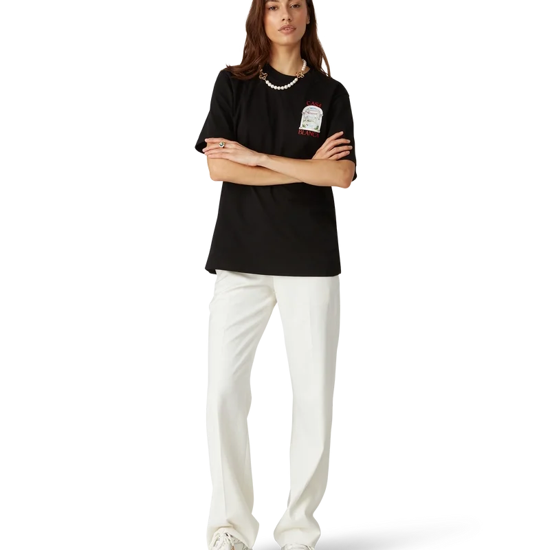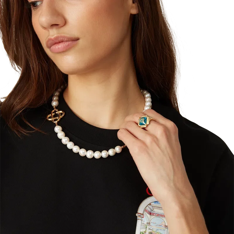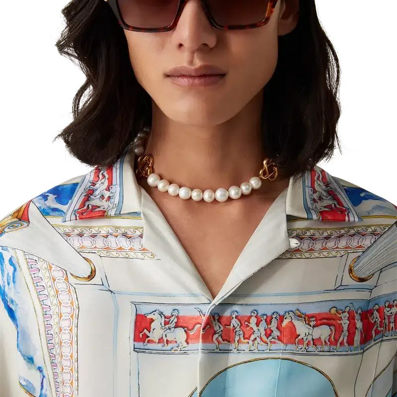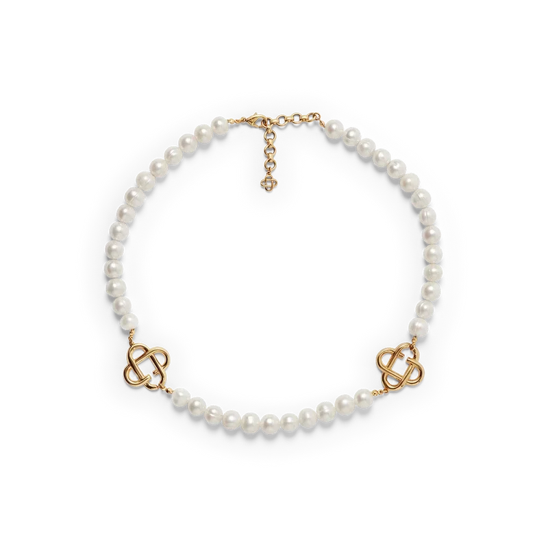 Medium Pearl Logo-halsbandet placerar Casablanca-logotypen tvärs över halsen, med en design avsedd för en tät passform. Halsbandet är 18K guldpläterat och har 30 stora sötvattenspärlor.