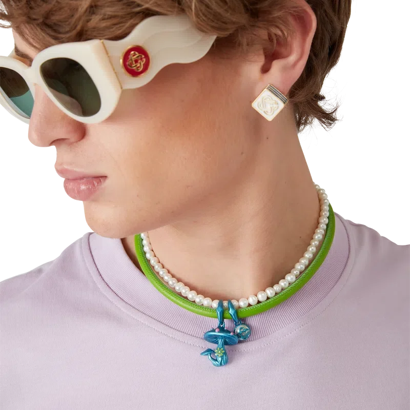 Mini Mushroom-halsbandet är tillverkat av läder och sötvattenspärlor och har ett av husets klassiska designelement. Kompletterat med en blå svampberlock samt ett guldpläterat karbinlås och kedja.