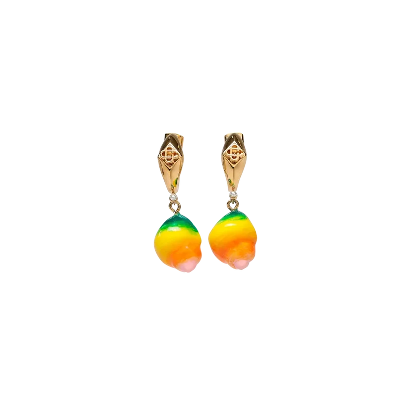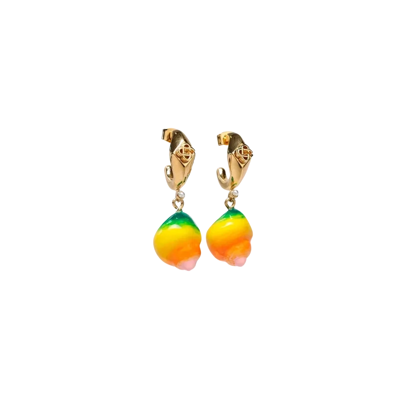 De droppformade örhängena är tillverkade av guldpläterade mässingsringar med husets sammanlänkade CC-logotyp och små snäckskal i regnbågsfärger. Kompletterade med glaspärlor.