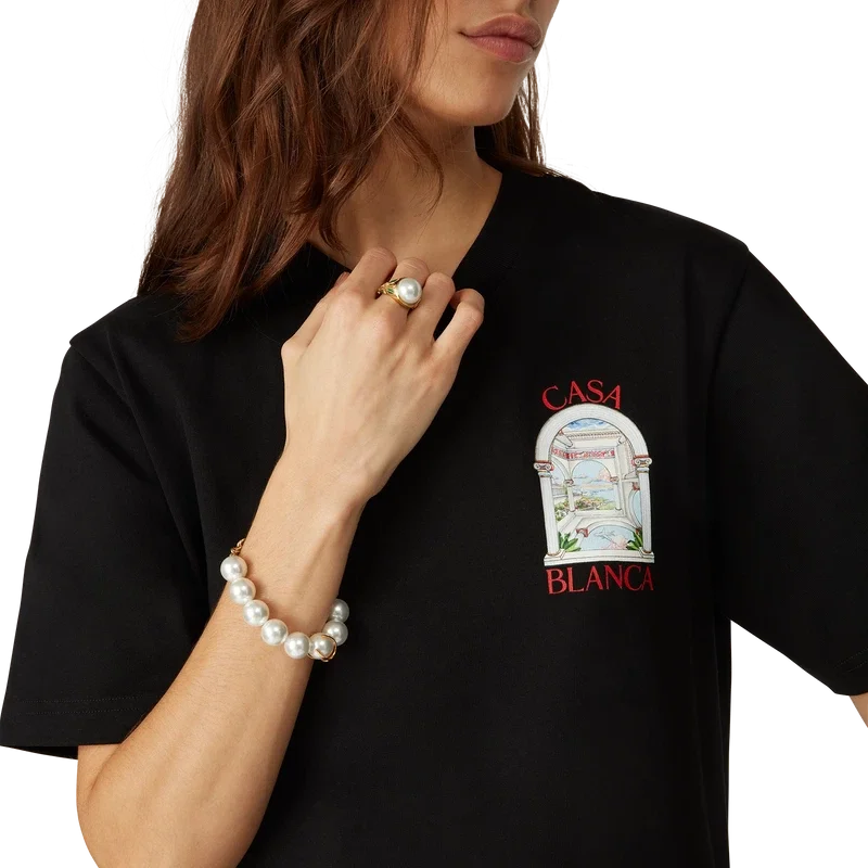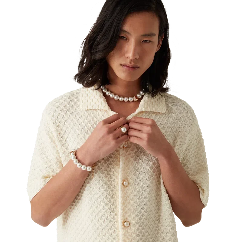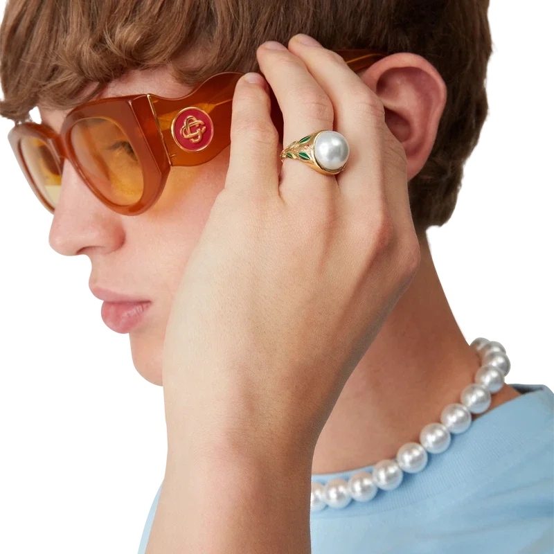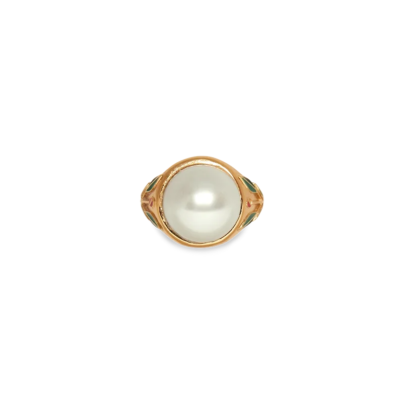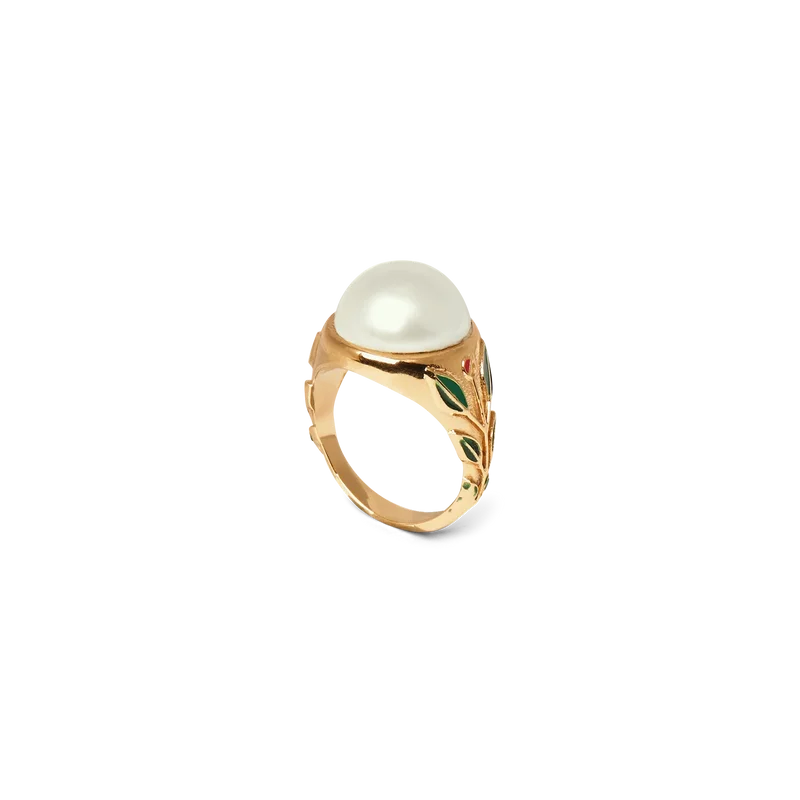 Pärlsignetringen är tillverkad av guldpläterad mässing, emalj och glaspärlor i cabochonslipning. Den är försedd med handmålade blomdetaljer på ringstammen och levereras med en presentask, en dammpåse med varumärkeslogotyp och en produktbroschyr.