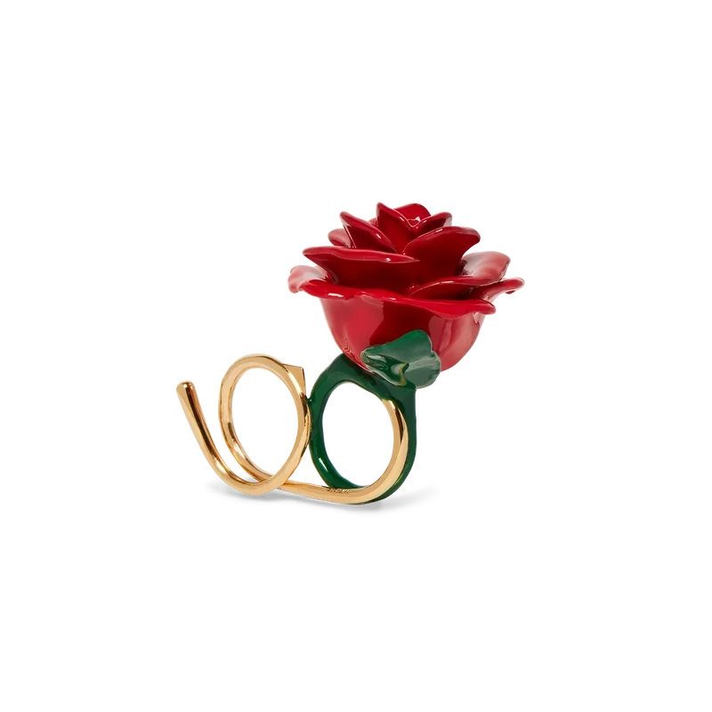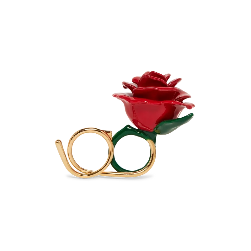 Rose Double Ring är inspirerad av La’s Subcultures-tatueringar och tillverkad av handmålad emalj och guldpläterad mässing. Rosen slingrar sig runt dina fingrar och bildar en dubbel fingerring.