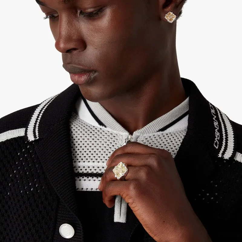 Splash Signet Ring är tillverkad av mässing med silverfinish och har ett flytande stänkmönster. Avslutas med husets sammanlänkade Cc-logotyp. Denna artikel levereras med en dammpåse med Casablanca-logotyp, en låda och en produktbroschyr.