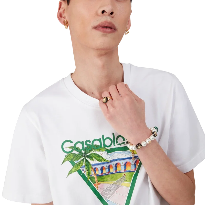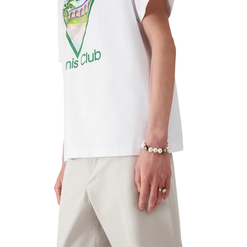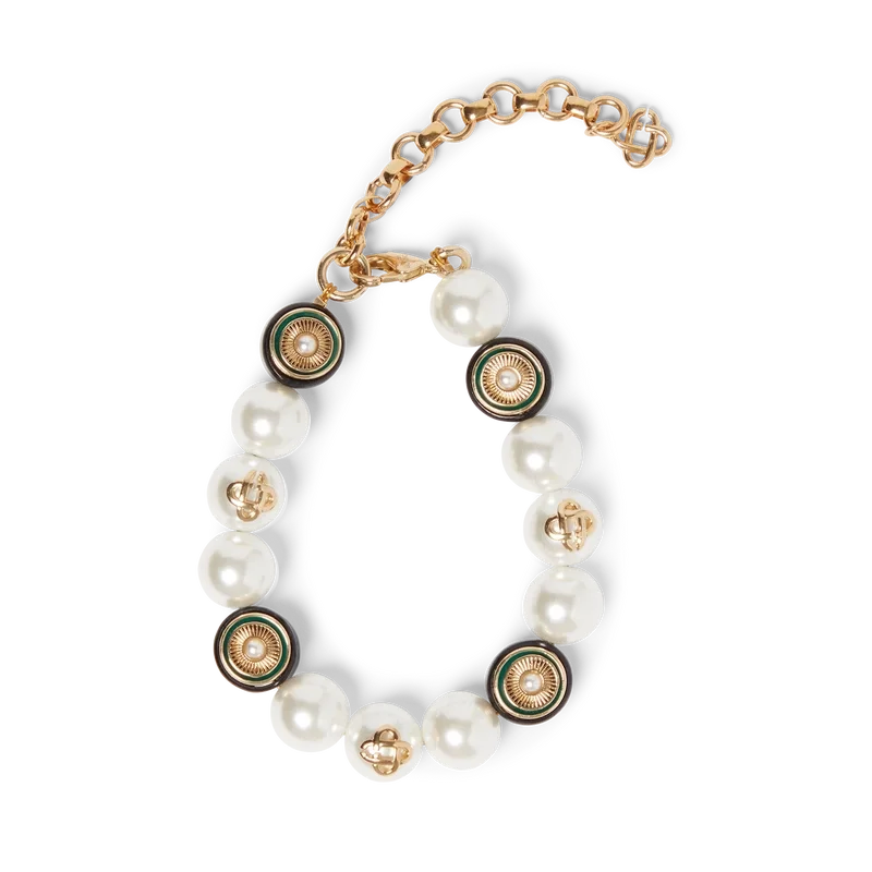 Spoke Wheel-armbandet är tillverkat av guldpläterad mässing, emalj och sötvattenspärlor. Det kompletteras med husets sammanflätade CC-logotyp, guldpläterad kedja och karbinlås.